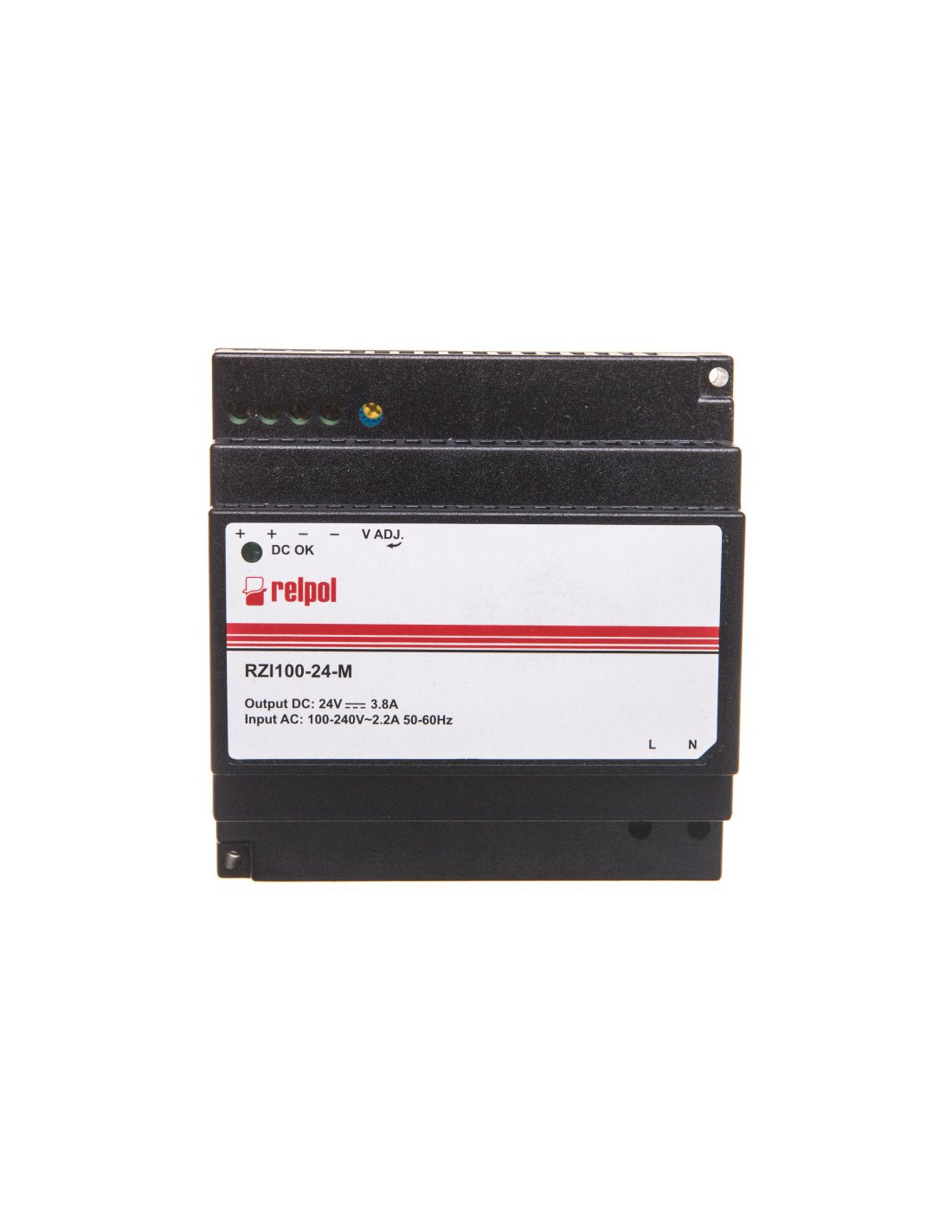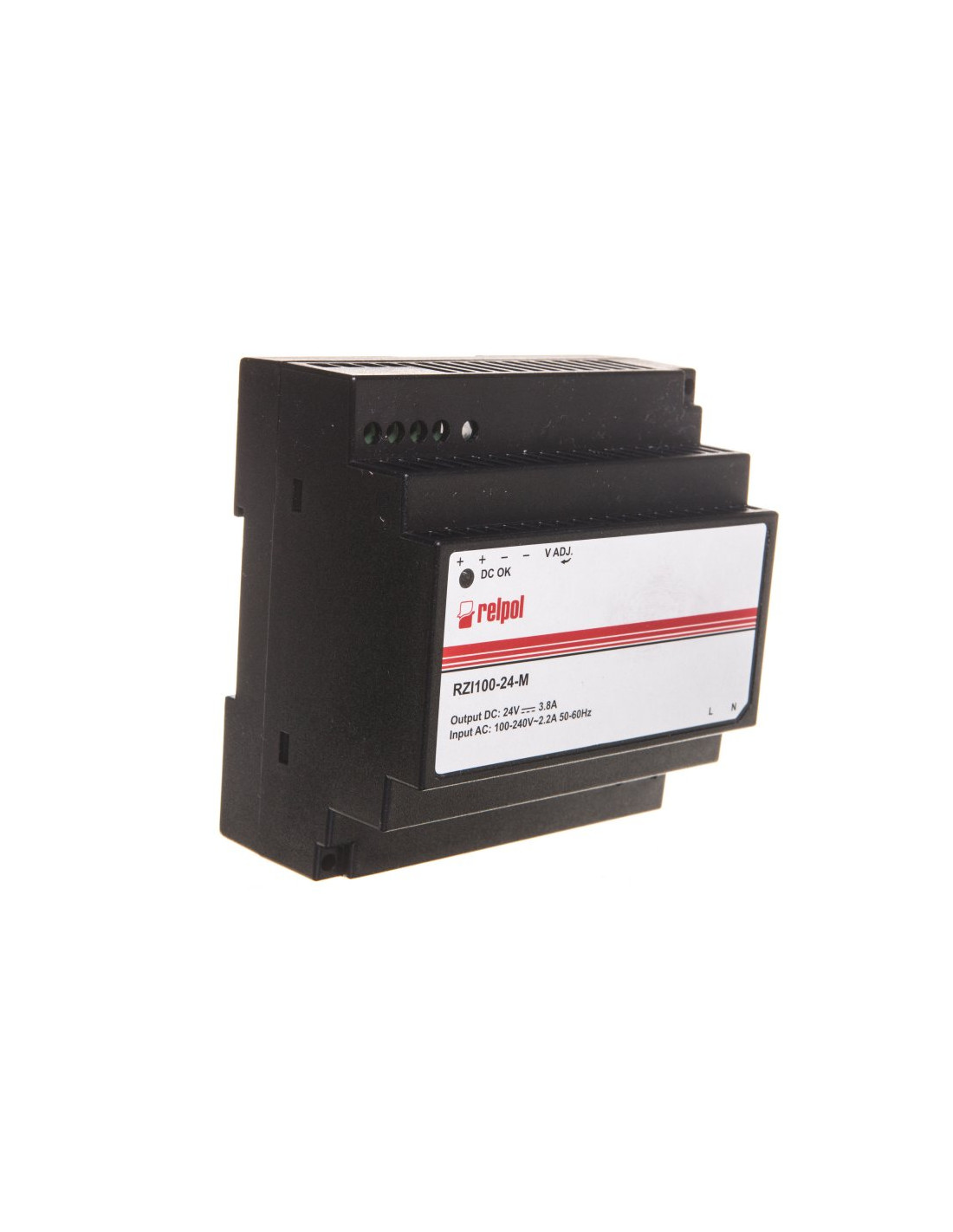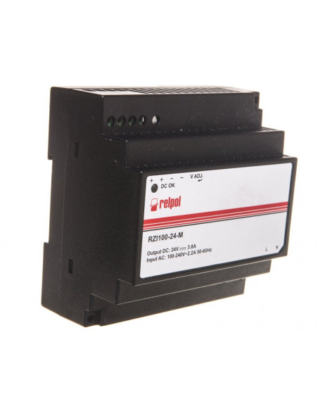 Zasilacz impulsowy w plastikowej obudowie modułowej, bezpośredni montaż na szynie 35mm. (możliwośc montażu natablicowego). Uniwersalne napięcie zasilania 90-264VAC (125-375VDC). Obwód wyjściowy : 24VDC 3,8A Moc 100W. II klasa ochronności. Zabezpieczenia: przepięciowe, przeciążeniowe, temperaturowe. Szerokość: 89,9mm