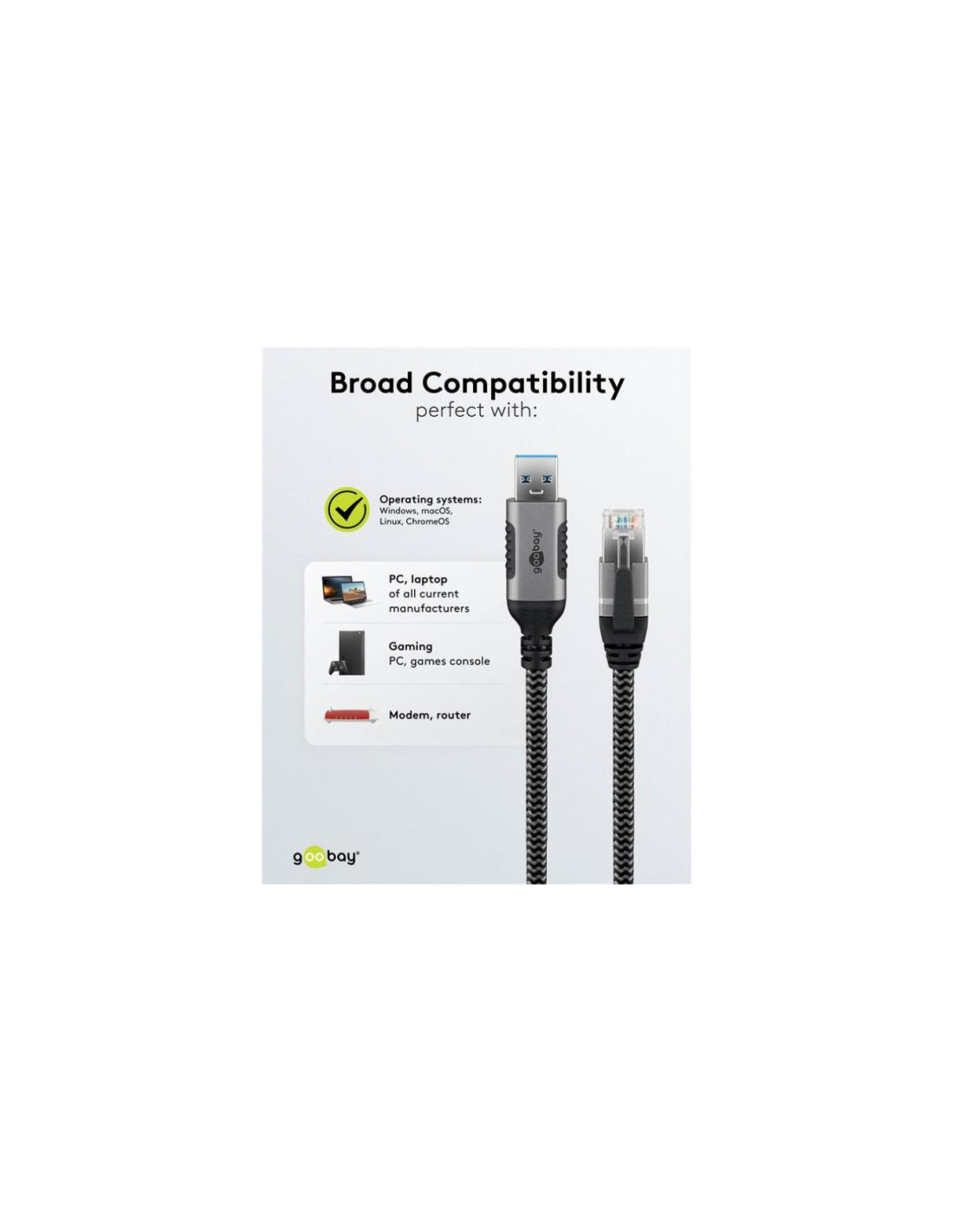 Kabel LAN umożliwia stabilne, przewodowe połączenie internetowe z urządzeniami USB-A bez własnego kabla sieciowego