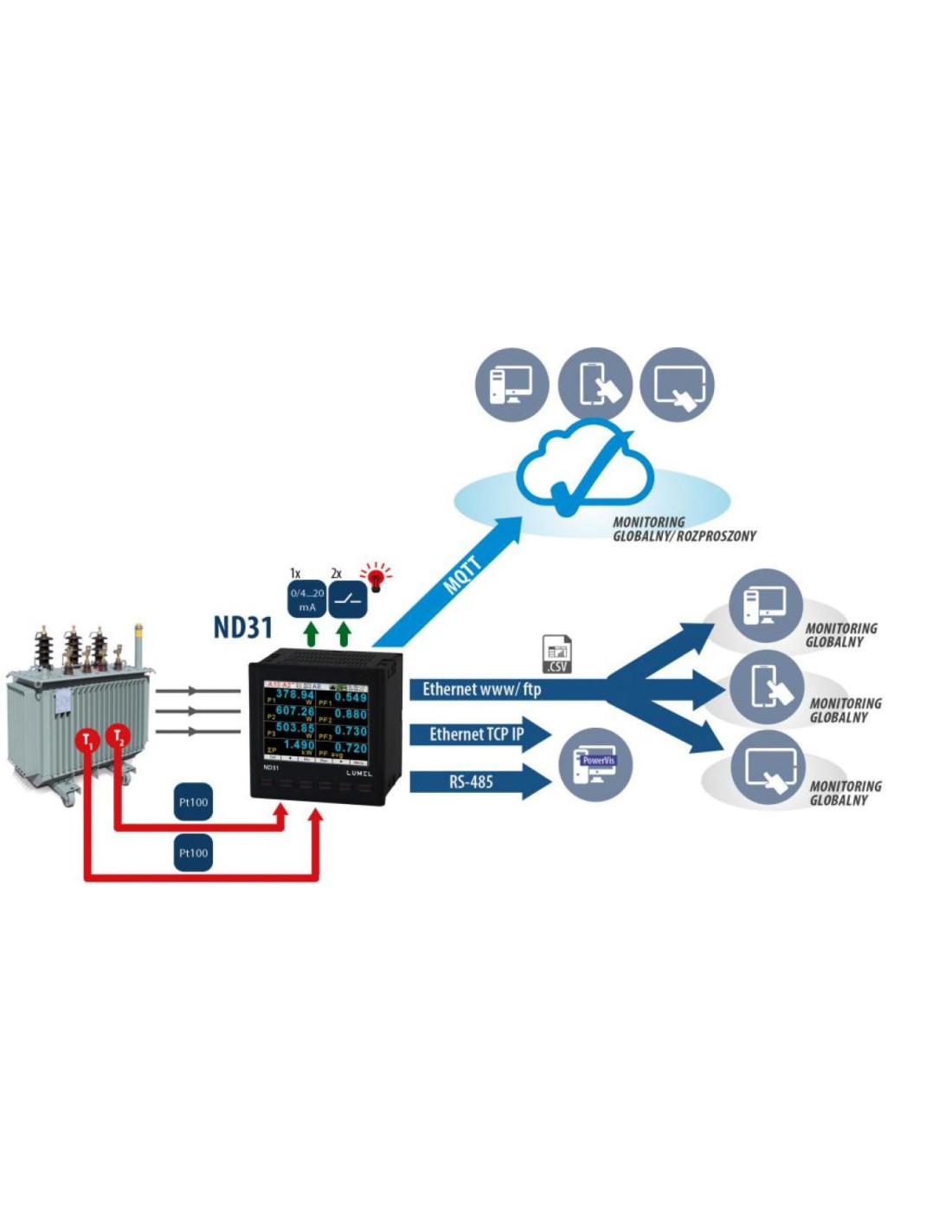 Wyjście analogowe 0/4...20 mA i 2 wejścia Pt 100 (np. do pomiaru temperatury transformatora).