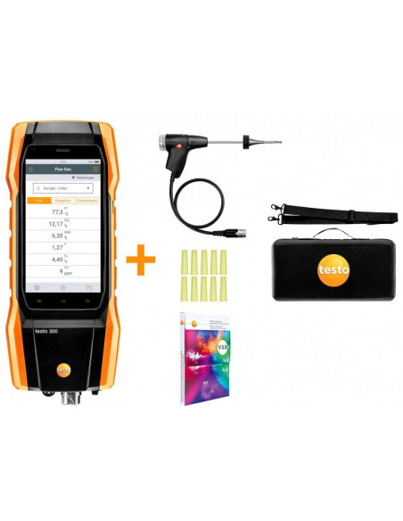 Zestaw z analizatorem spalin testo 300 jest idealnym narzędziem do wszystkich zadań pomiarowych w ogrzewnictwie, testowany przez TÜV, dostarczany w zestawie z sensorami O2 i CO z kompensacją H2 do 8000 ppm, podstawową sondą spalin, torbą transportową i innymi praktycznymi akcesoriami.