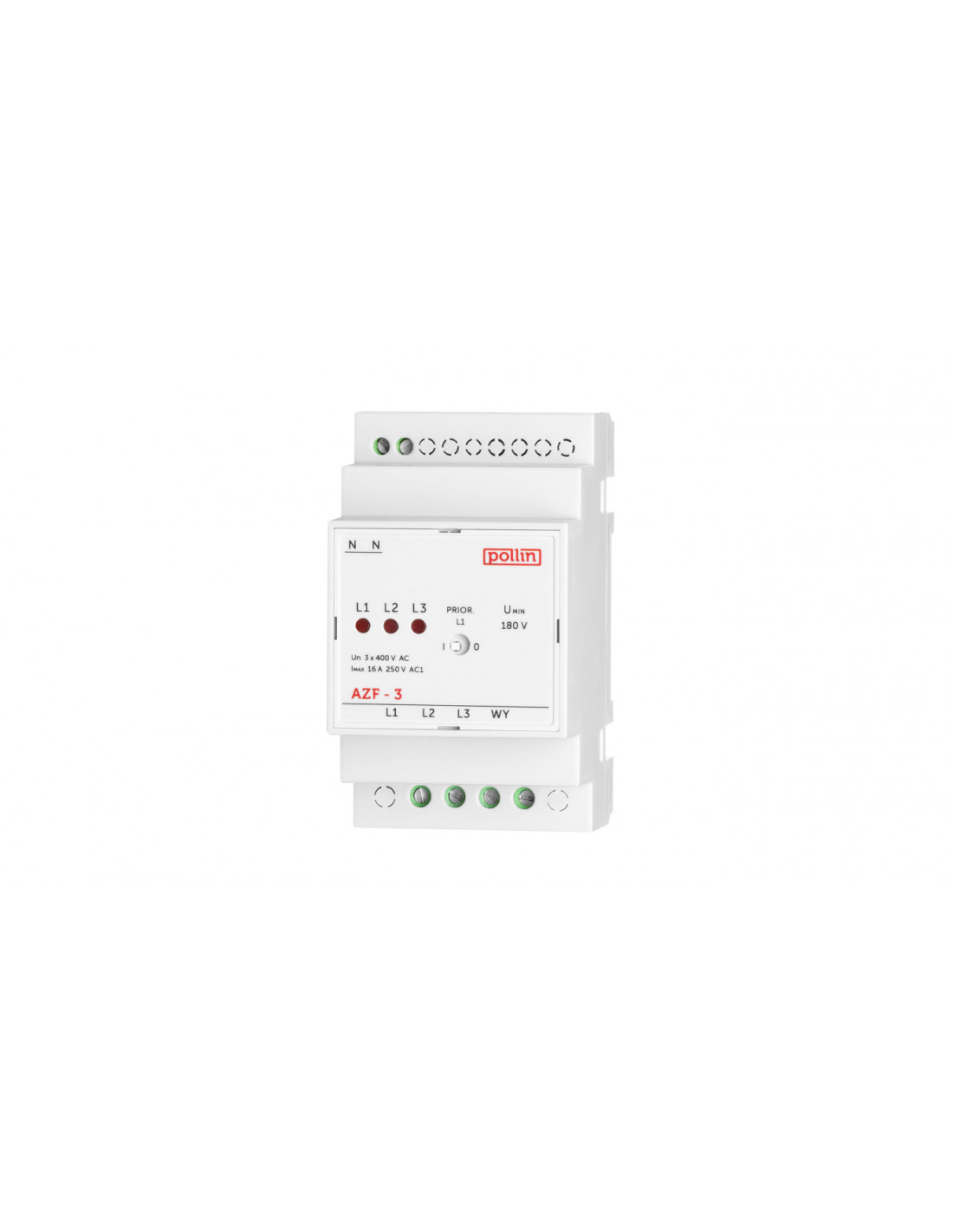 Automatyczny przełącznik faz AZF-3 służy do zapewnienia ciągłości pracy odbiorników jednofazowych. Potrzebny jest wszędzie tam, gdzie parametry napięcia zasilającego mają istotny wpływ na pracę urządzeń. Może współpracować z aparaturą medyczną, oświetleniem podstawowym i awaryjnym, klimatyzacją, urządzeniami chłodniczymi, systemami alarmowymi, sieciami komputerowymi i telekomunikacyjnymi, sieciami telewizji kablowych, monitoringiem itp. Do wejścia urządzenia doprowadza się zasilanie z sieci trójfazowej, a z jego wyjścia wyprowadza się napięcie zasilające odbiornik jednofazowy. Układ elektroniczny kontroluje wartość napięcia w sieci i w momencie jego spadku poniżej określonej wartości lub całkowitego zaniku przełącza odbiornik na drugą fazę, a jeżeli ta również jest nieprawidłowa, to bezpośrednio na trzecią.AZF-3 posiada przełącznik wyboru trybu pracy, który umożliwia pracę z priorytetem fazy "L1" (będzie zawsze wybrana, gdy będzie miała prawidłowe parametry) lub bez priorytetu tej fazy.Automatyczny przełącznik faz AZF-3 wykonywany jest w obudowie z tworzywa samogasnącego, przeznaczonej do montażu na szynie TH- 35. AZF-3 wyposażony jest w sygnalizację świetlną, informującą, która faza jest aktualnie wybrana. UWAGA: W AZF-3 nie można przyłaczyć dodatkowych styczników. Służy do bezpośredniego zasilania odbiorników jednofazowychDla większych obciążeń należy zastosować inny typ urządzenia, do którego można przyłączyć styczniki (np. AZF-4)