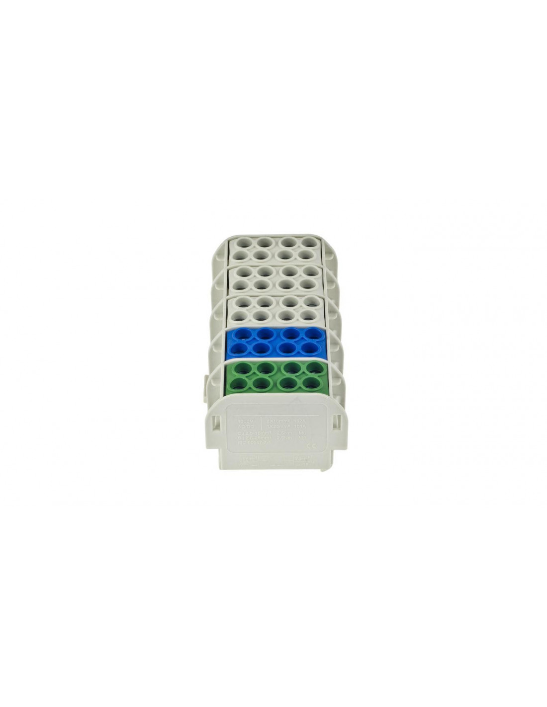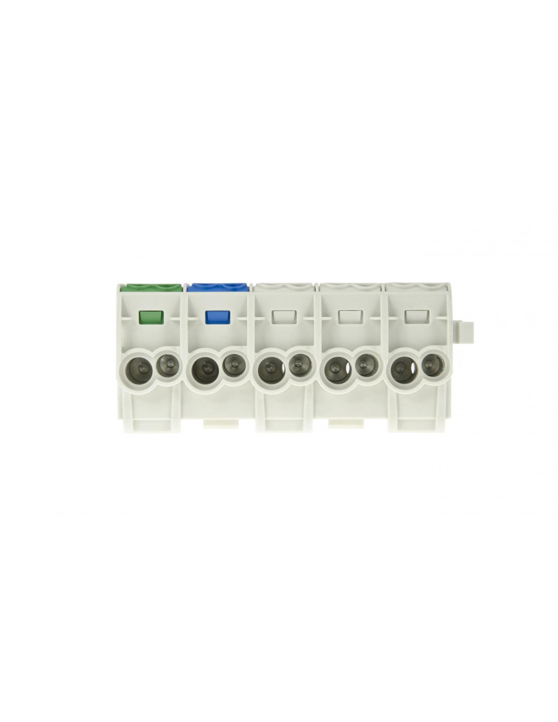 Złączka Szynowa - Blok rozdzielczy - odgałęźny Al/Cu o prądzie znamionowym 101A/152A oraz napięciu znamionowy:1000V Bloki Rozdzielczy pięciopolowy o przekroju 1x25/2x16 mm2 w kolorze 3 szary, 1 x niebieski, 1 x zielony. Moduły przystosowane do łączenia ze sobą