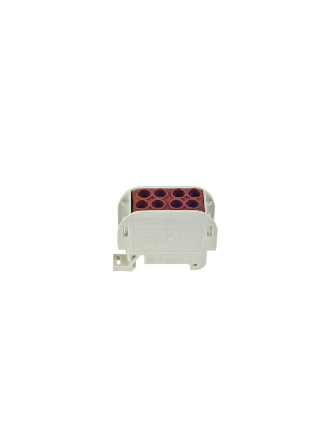 Złączka Szynowa - Blok rozdzielczy - odgałęźny Al/Cu o prądzie znamionowym 101A/152A oraz napięciu znamionowy:1000V Blok Rozdzielczy jednopolowy o przekroju 1x25mm2/2x16mm2 w kolorze brązowym