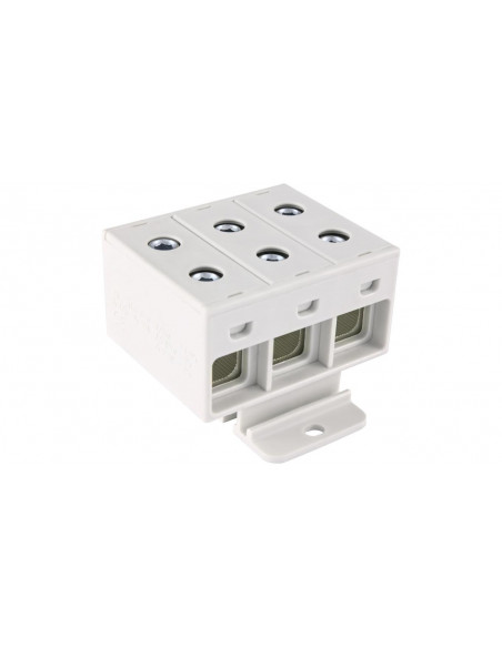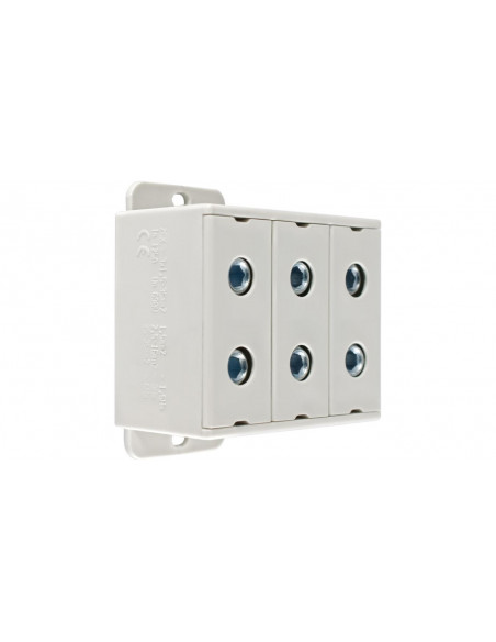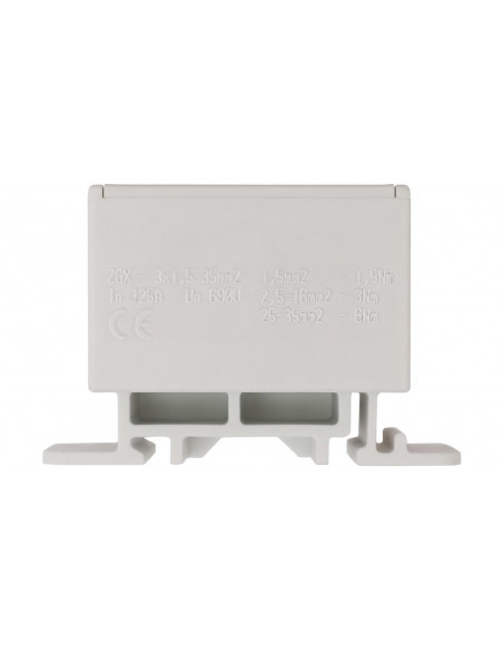 Uniwersalna złączka śrubowa ZGX, jednobiegunowa z sześcioma otworami, w kolorze szarym, dla przewodów o przekroju od 1,5 do 35 mm2, w kompaktowej obudowie o małych wymiarach, wykonanej z tworzywa PA6 bez halogenowego, sklasyfikowanego w najwyższym standardzie palności UL V-0 (test pionowego palenia), możliwy montaż złączki zarówno na szynie TH jaki i bezpośrednio na płycie montażowej, z zaciskami na śrubę sześciokątną, które pozwalają na łatwe i mocne dokręcanie przewodu. Złączki ZGX są testowane i certyfikowane zgodnie z normą EN 60947-7-1:2012 oraz EN 61238-1.