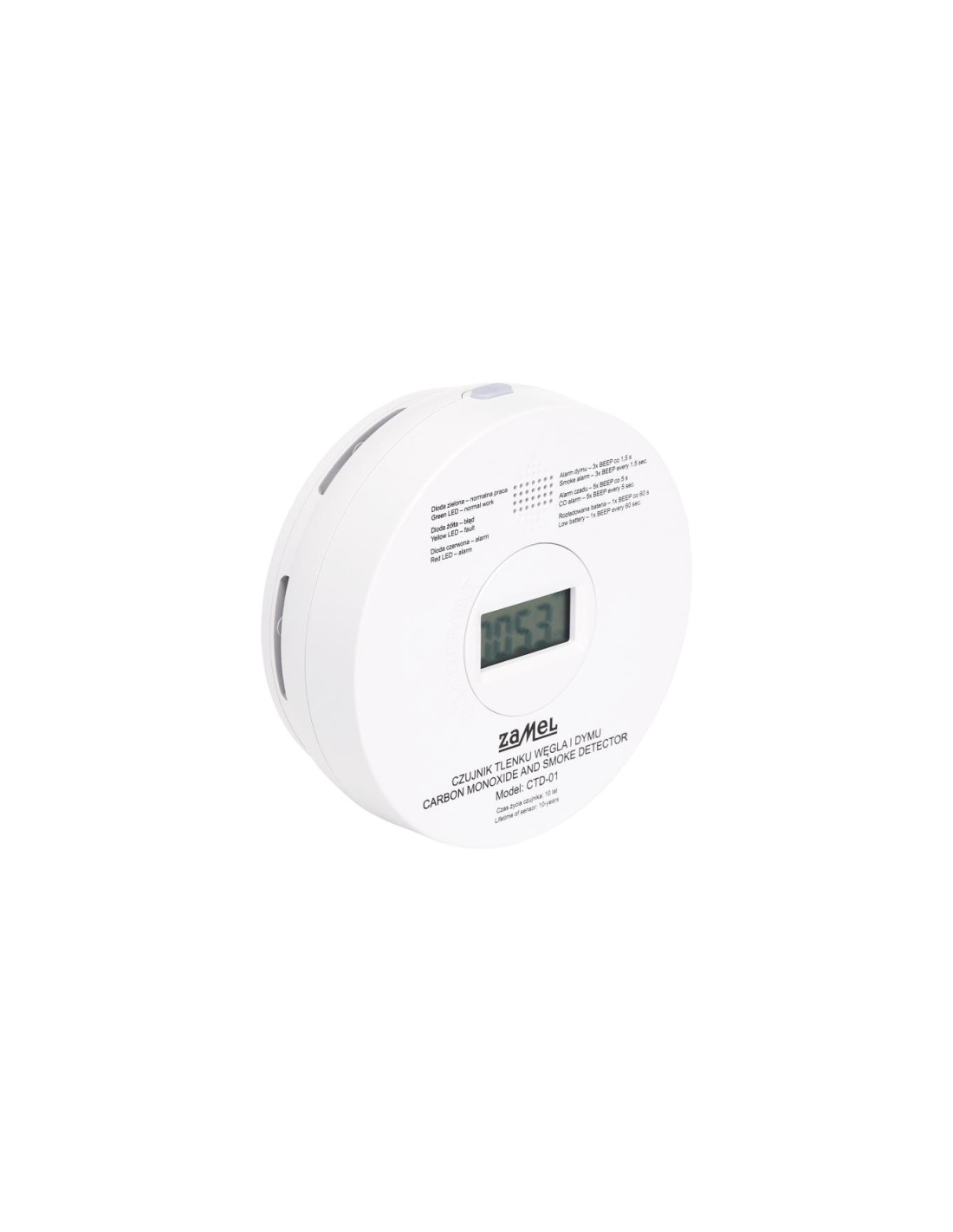 Czujnik CTD-1 służy do ciągłego monitorowania niebezpiecznego stężenia tlenku węgla oraz dymu w powietrzu. Ostrzegając zarówno przed zatruciem czadem jaki i zagrożeniem pożarowym. W momencie wykrycia zagrożenia czujnik uruchamia głośny sygnał dźwiękowy (min. 85 dB) oraz optyczny w postaci migającej diody. Wyposażony jest w precyzyjne i niezawodne czujniki elektrochemiczny i fotoelektryczny o żywotności 10 lat. Znakomitą jego zaletą jest także to, że ma on wbudowaną wydajną baterię litową wystarczającą na cały okres życia czujnika.