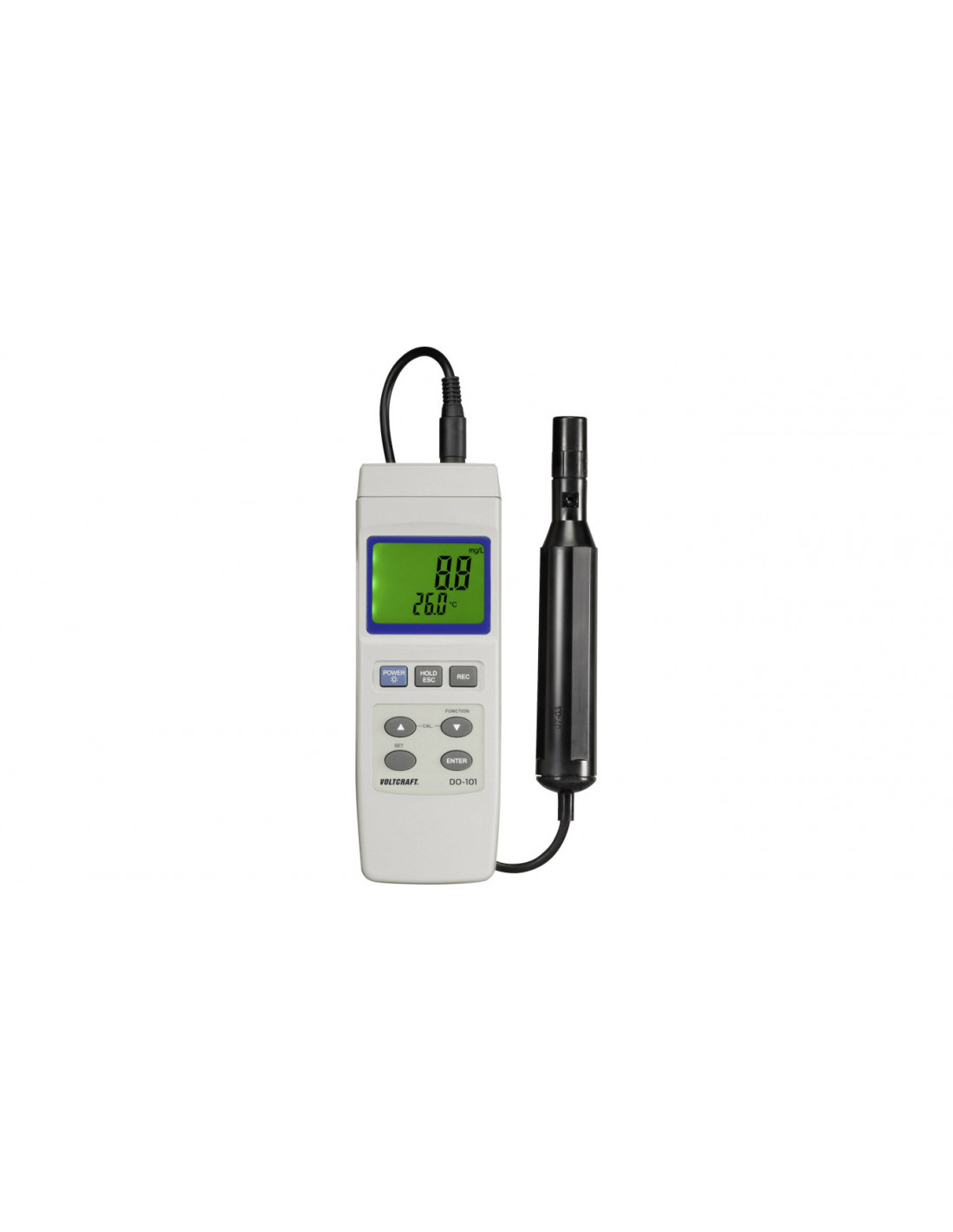 Przenośny miernik do wykrywania rozpuszczonego tlenu (DO) i temperatury. Poręczne urządzenie ma zewnętrzny czujnik i dlatego jest łatwe w użyciu. Miernik jest idealny do pomiarów w akwariach, galwanizacji, kontroli jakości, przetwarzania żywności i wielu innych. Za pomocą funkcji Data Hold wartości można zmierzyć w trudno dostępnych miejscach, a następnie łatwo i wygodnie odczytać. Urządzenie ma interfejs RS232 i USB, dzięki czemu dane można później łatwo ocenić na komputerze.