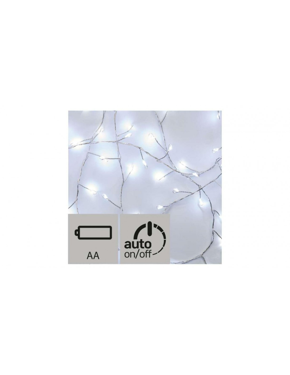 auto on/off, kolor przewodów: srebrna, barwa światła: zimna biel, długość łańcucha LED: 2,4 m, długość przewodu: 0,5 m, stopień ochrony: IP20, odstęp między diodami LED: 2,4 cm, napięcie: 4,5 V DC, ilość LED: 100, zastosowanie: wewnętrzne, opakowanie: 1 szt., pudełko, moc: 0,9 W, tryby świecenia: świeci, kształt: nano, typ: girlanda, typ zasilania: 3× AA, wielkość diod LED: nano 3 mm, okres gwarancyjny: 2 lata, żywotność: 50 000 godzin