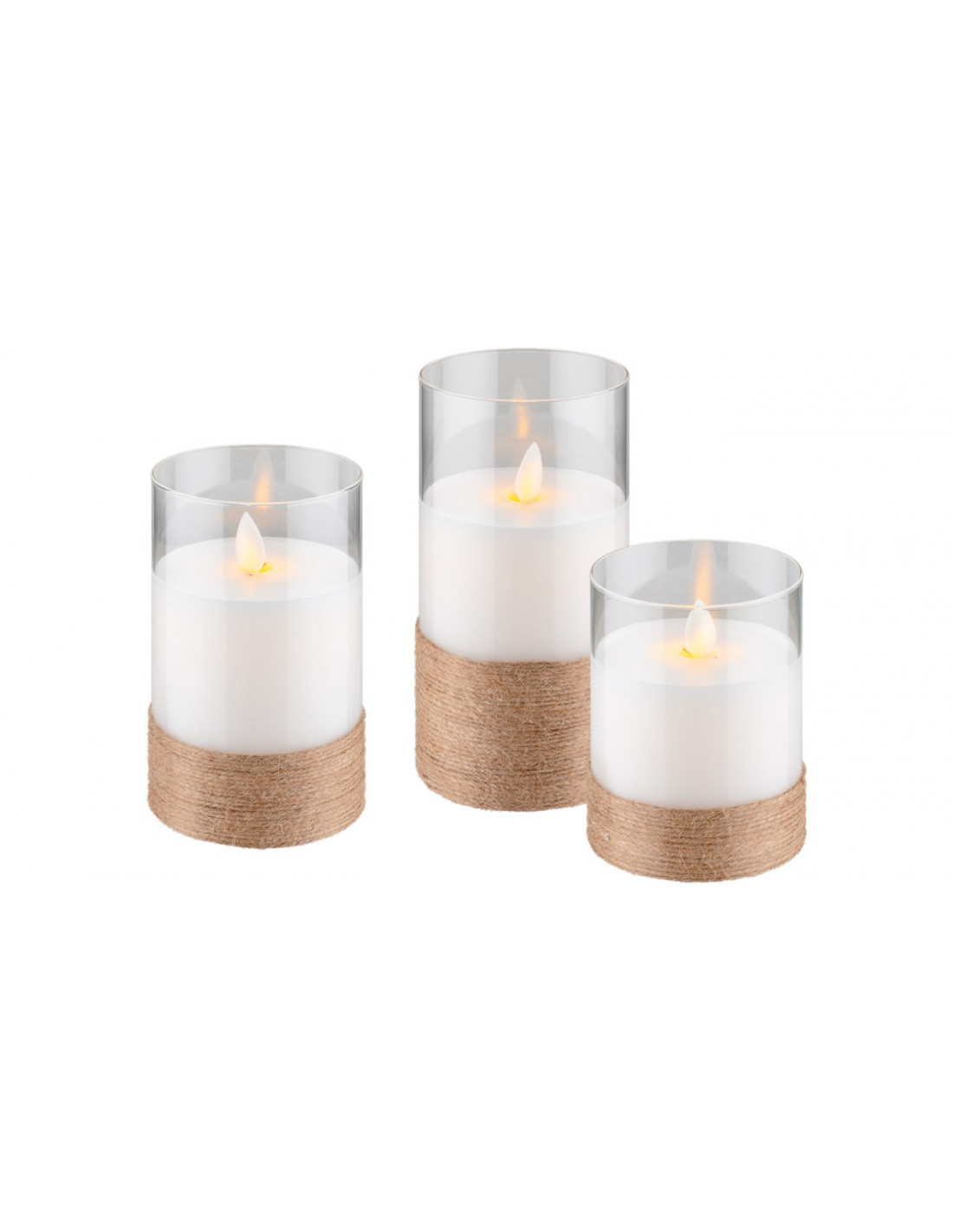 zestaw 3 białych świec LED z przezroczystego szkła, owiniętych konopiami, wymiary: 7,5 x 10/12,5/15 cm