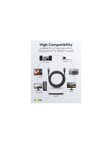 Kabel zapewnia rozdzielczość Ultra HD do 4K @ 50/60 Hz i szybkość przesyłania danych do 18 Gbit/s z DisplayPort™ 1.2 i HDMI™ 2.0