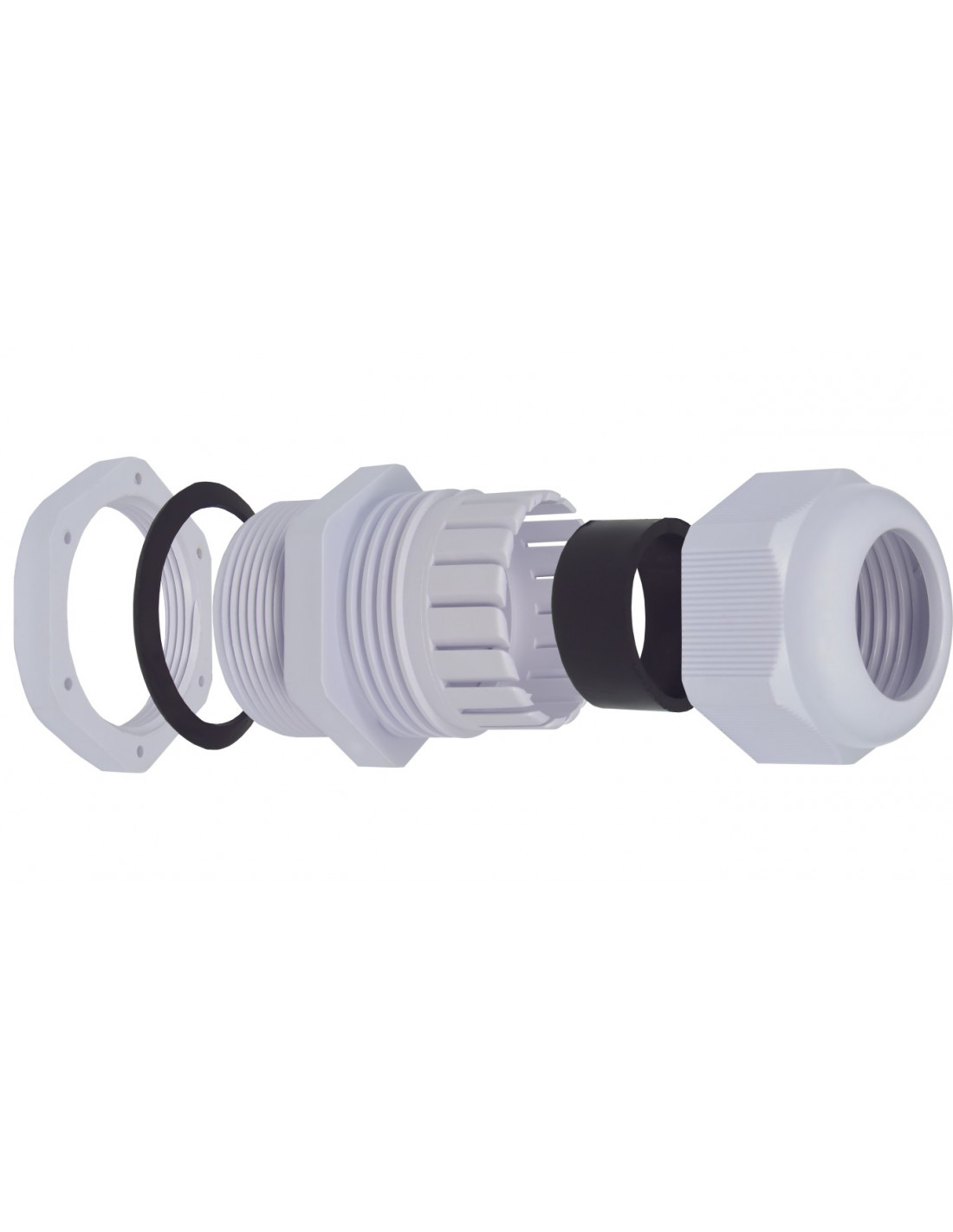 Dławnica PG63 przeznaczona do uszczelniania przejść przewodów przez obudowy urządzeń elektrycznych. Wykonana z poliamidu PA66 koloru szarego, w klasie palności UL94-2 oraz uszczelek z EPDM, specjalna konstrukcja dławicy zapobiega skręceniu się kabla wewnątrz i zapewnia dużą wytrzymałość na zerwanie. Łatwe w montażu. Konstukcja wydaje dzwięk kliknięcia przy dokręcaniu, możliwość ponownego odkręcenia. Pozwalają na osiągnięcie stopnia ochrony IP 68 (klasa szczelności 10 bar wg. EN60529). Temperatura pracy: -40 st.C do +100 st.C (krótkotrwała do +120 st.C). Oferowane w komplecie z uszczelką i nakrętką.