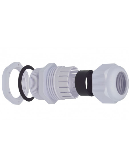 Dławnica M18 przeznaczona do uszczelniania przejść przewodów przez obudowy urządzeń elektrycznych. Wykonana z poliamidu PA66 koloru szarego, w klasie palności UL94-2 oraz uszczelek z EPDM, specjalna konstrukcja dławicy zapobiega skręceniu się kabla wewnątrz i zapewnia dużą wytrzymałość na zerwanie. Łatwe w montażu. Konstukcja wydaje dzwięk kliknięcia przy dokręcaniu, możliwość ponownego odkręcenia. Pozwalają na osiągnięcie stopnia ochrony IP 68 (klasa szczelności 10 bar wg. EN60529). Temperatura pracy: -40 st.C do +100 st.C (krótkotrwała do +120 st.C). Oferowane w komplecie z uszczelką i nakrętką.