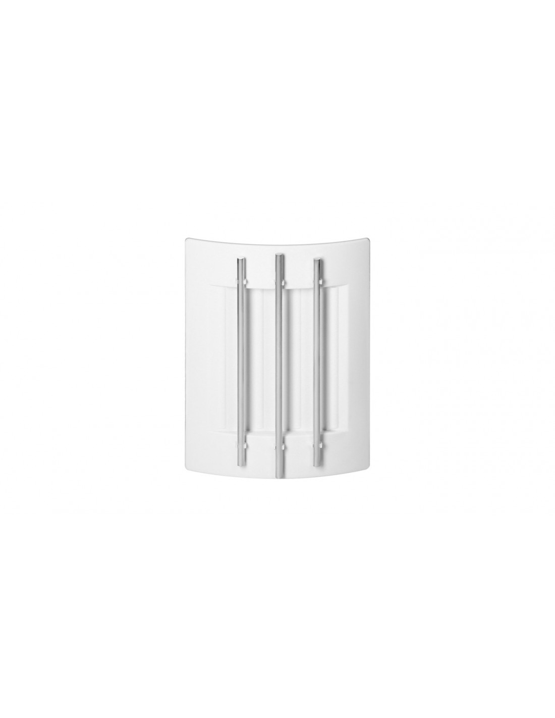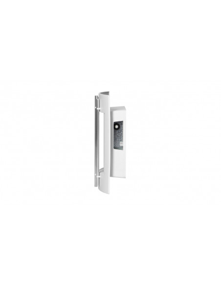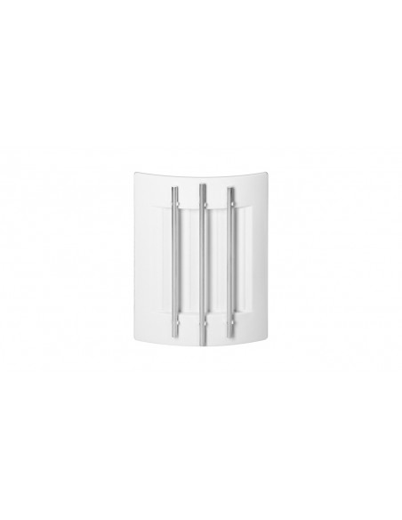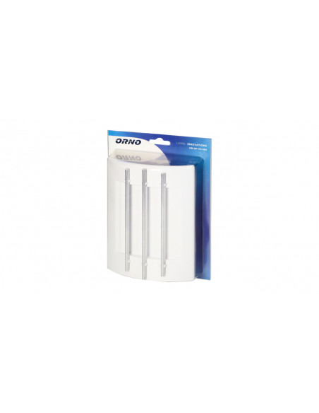 Przewodowy dzwonek elektromechaniczny, dwa dźwięki BIM-BAM. Obudowa dzwonka jest biała, a elementy dekoracyjne są w kolorze srebrnym.
