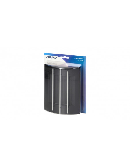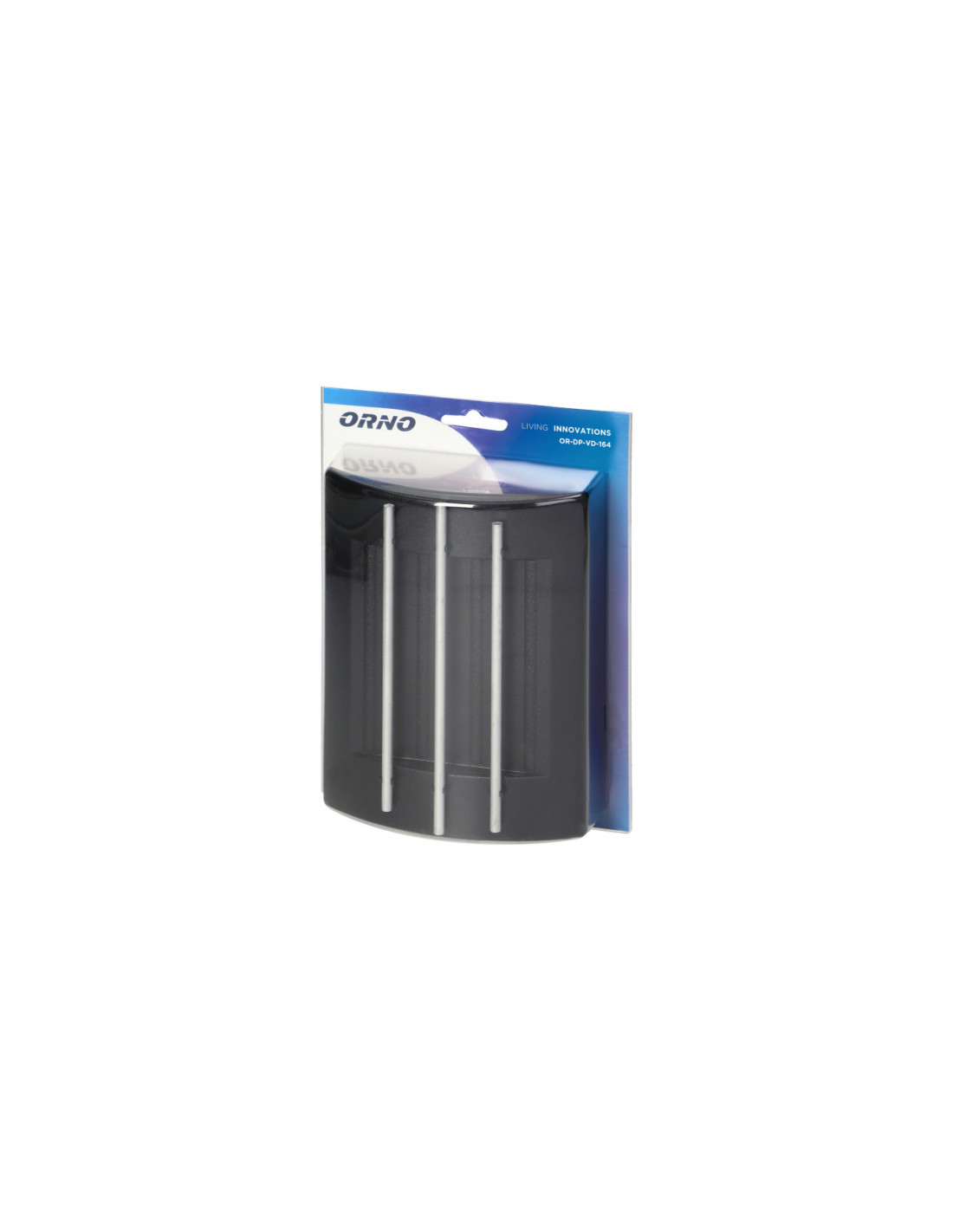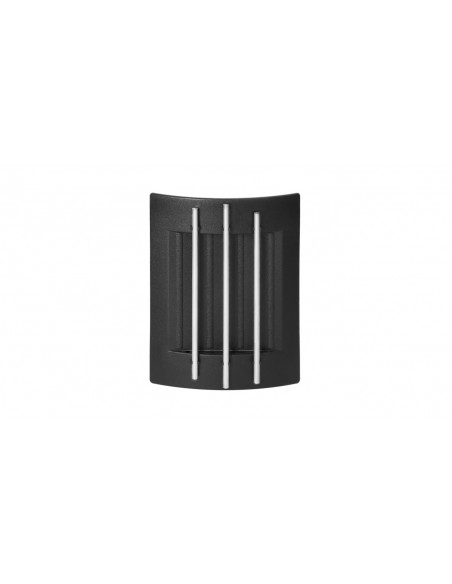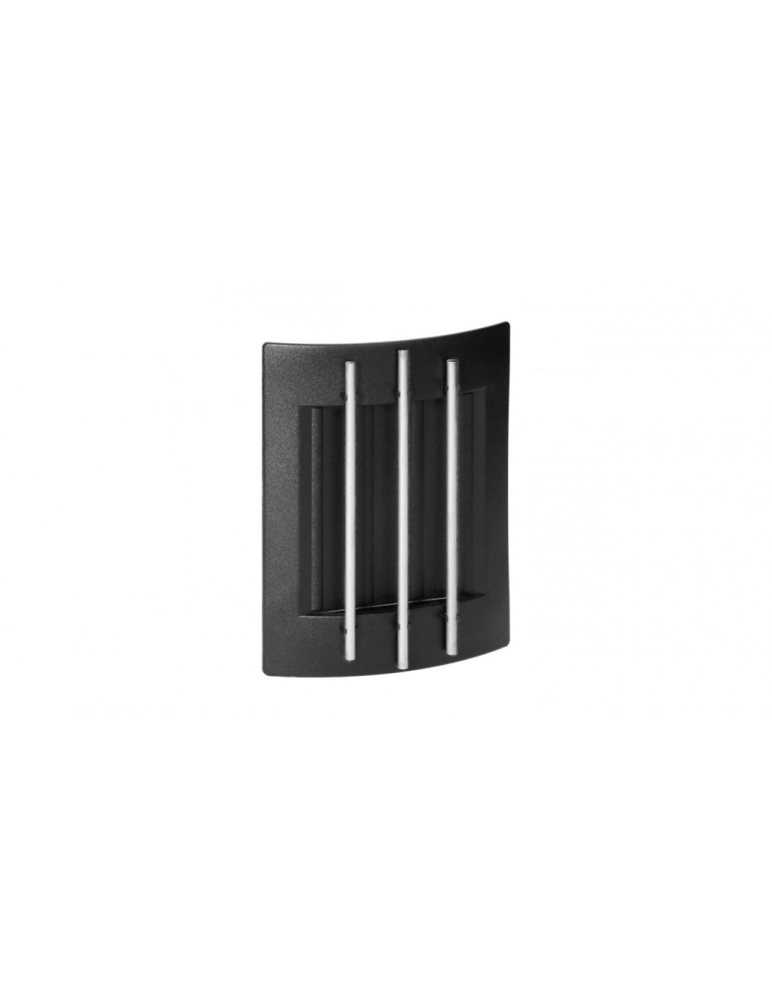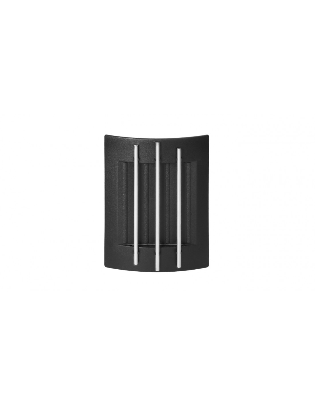 Przewodowy dzwonek elektromechaniczny, dwa dźwięki BIM-BAM. Obudowa dzwonka jest czarna, a elementy dekoracyjne są w kolorze srebrnym.