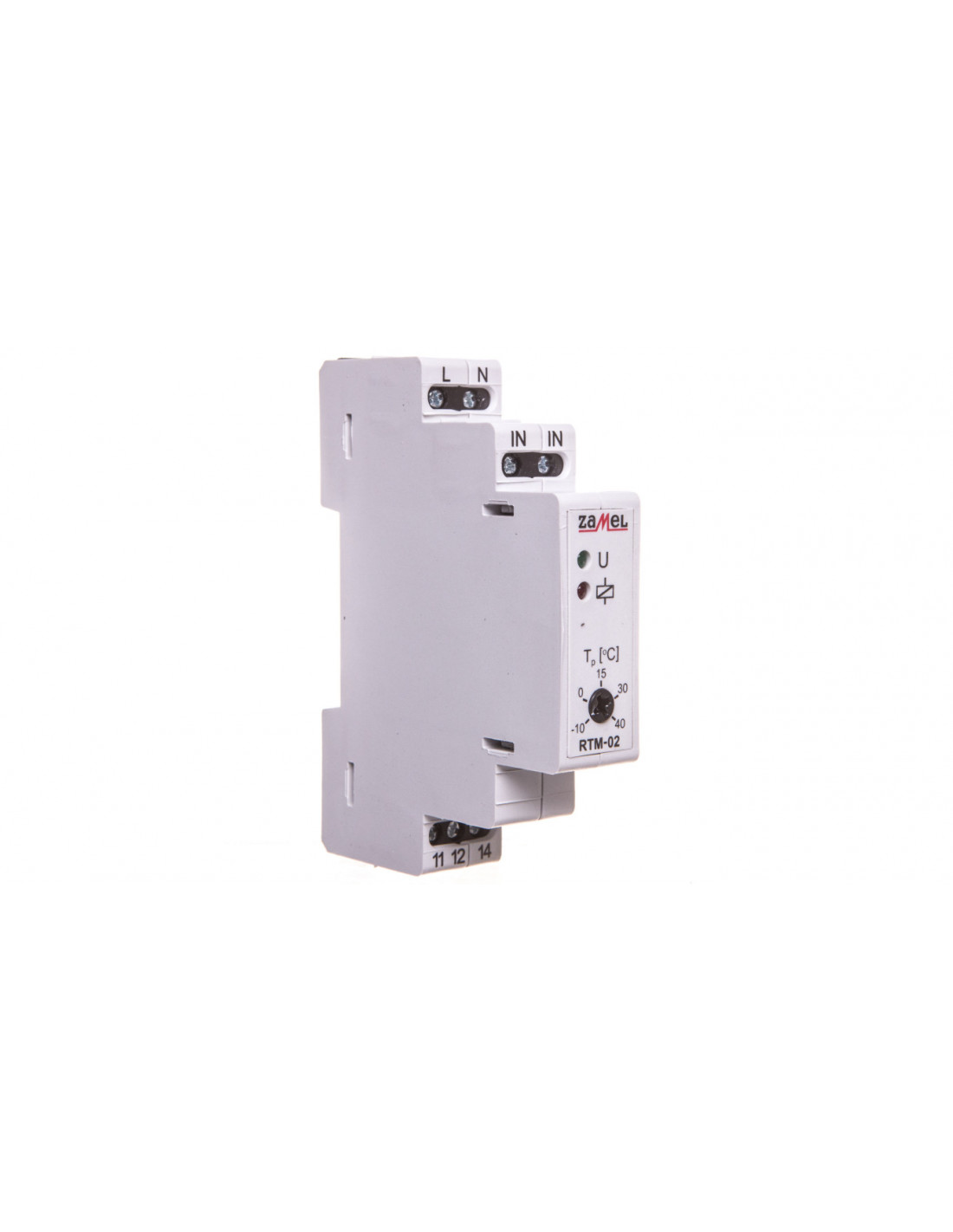 Regulator temperatury RTM-02 służy do sterowania odbiornikami (np. grzejniki, ogrzewanie podłogowe, systemy antyoblodzeniowe) w zależności od temperatury panującej w otoczeniu zewnętrznego czujnika NTC. Urządzenie posiada możliwość regulacji temperatury zadanej za pomocą potencjometru znajdującego się na panelu przednim w zakresie -10 oC ÷ +40 oC. Do poprawnej pracy urządzenie wymaga podłączenia zewnętrznej sondy NTC-03. Sonda nie występuje w komplecie z regulatorem i należy nabyć ją oddzielnie. Przewód sondy ma 3 m długości i można go przedłużyć do 50 m przewodem o przekroju 0,2 ÷ 2,50 mm2. Sond nie można łączyć.