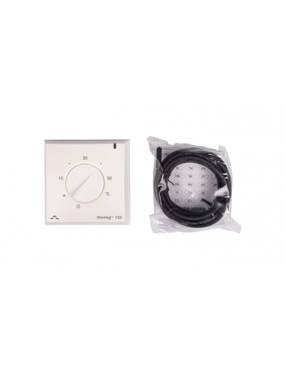 Regulator temperatury DEVIREG 132 to model pochodzący z szerokiej oferty sprzedażowej, oferowanej przez firmę DEVI - duńskiego producenta, który już od ponad 70 lat specjalizuje się w produkcji wysokiej jakości elektrycznych systemów grzejnych. Termostat DEVIREG został wyposażony w czujnik powietrza oraz, opcjonalnie, w limiter temperatury podłogi, dlatego znajdzie zastosowanie w kontroli i sterowaniu instalacjami wewnętrznego ogrzewania podłogowego. Przeznaczony jest do montażu natynkowego. Do jego prawidłowej pracy zaleca się instalację na wysokości od 80 do 170 cm i w odległości minimum 50 cm od okien i drzwi. Dla rzetelnych wyników producent poleca montaż w słabo nasłonecznionym miejscu. Termostat pracuje przy napięciu znamionowym 230 V i maksymalnym natężeniu do 16 A. Posiada przełącznik włącz/wyłącz oraz system redukcji temperatury. W tym modelu w roli czujnika zamontowano specjalną sondę, a jego zakres temperatury mieści się w przedziale od 5 do 30°C. Różnica temperatur przełączania wynosi 0,2 K. Regulator zbudowany został z tworzywa sztucznego w białym kolorze, a jego stopień ochrony to IP30. Urządzenie jest bardzo proste w obsłudze, wymaga jedynie zastawienia pokrętła na wybraną przez użytkownika temperaturę. Jego wymiary to: 82 mm wysokości, 82 mm szerokości i 36 mm głębokości.