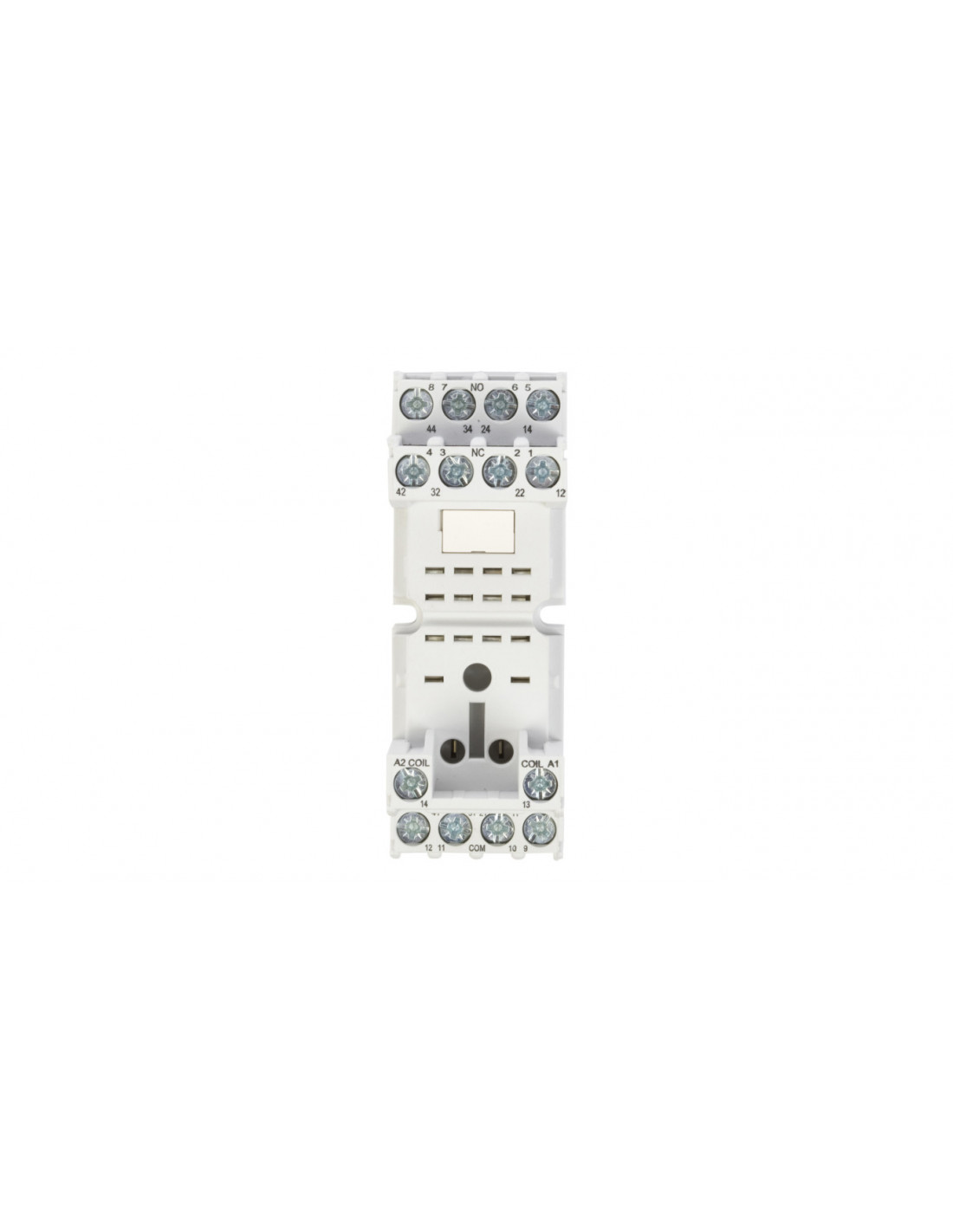 Gniazdo przekaźnikowe w kolorze czarnym z zaciskami śrubowymi, która przeznaczone jest do przekaźnika R4. Szerokość gniazda wynosi w tym przypadku 27 mm. Gniazdo wtykowe służy do zamontowania przekaźnika na szynie montażowej. Ten typ gniazda umożliwia jego funkcjonalną rozbudowę. Gniazdo jest przystosowane do instalowania modułów sygnalizacyjnych/przeciwprzepięciowych typu M.