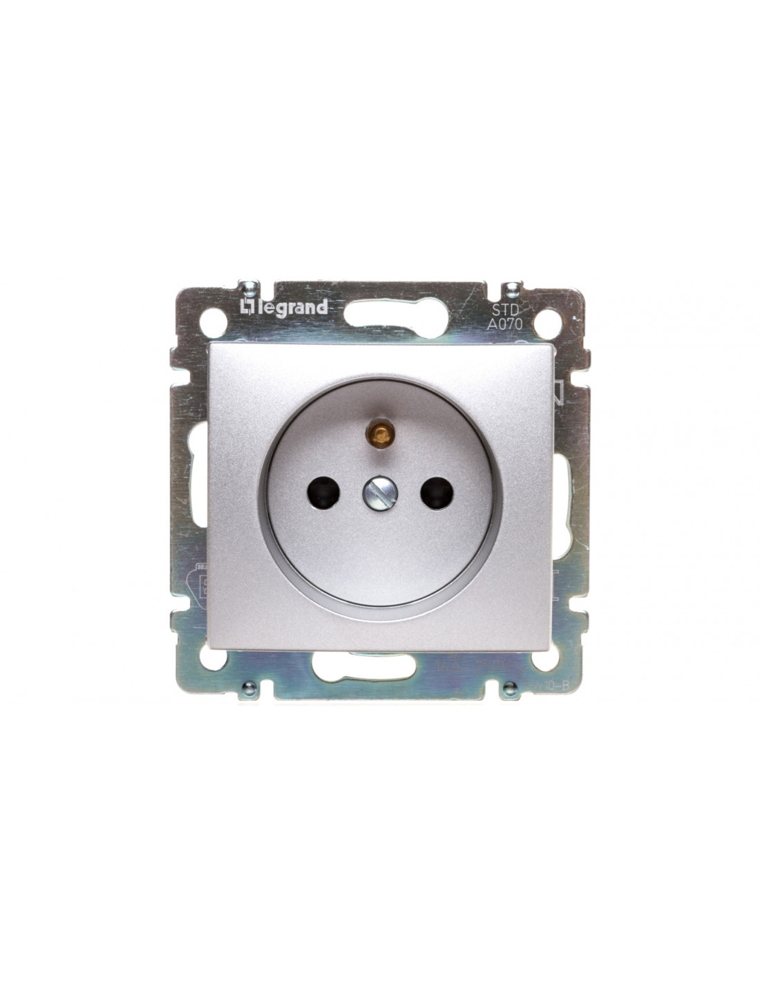 Gniazdo pojedyncze pochodzi z serii Valena marki LEGRAND. Wykonano je z bardzo trwałego tworzywa termoplastycznego w kolorze aluminium, wykończenie jest błyszczące. Model posiada bolec uziemiający. Nie wyposażono go w nadruk. Napięcie znamionowe dochodzi do 250 V, a prąd znamionowy osiąga 16 A. Prawidłowe wykonanie montażu powinno przebiegać podtynkowo przy pomocy pazurków i śruby. Do obwodu należy go podłączyć przy pomocy połączenia wtykowego, samozaciskowego. Gniazdo cechuje się stopniem ochrony IP20, który świadczy o odporności na ciała obce o średnicy 12,5 mm. Osprzęt nie powinien być wykorzystywany na zewnątrz, gdzie będzie narażony na szkodliwe działanie warunków atmosferycznych. Gniazdo nie posiada podświetlenia ani uchylnej pokrywy. Producent wyposażył je w zabezpieczenie przed dziećmi. Wykonawcą osprzętu jest marka LEGRAND szeroko znana w świecie elektroinstalacyjnym. Producent posiada wieloletnie doświadczenie w wytwarzaniu aparatury zabezpieczeniowej niskiego napięcia, rozdzielnic, listew i kanałów elektroinstalacyjnych.