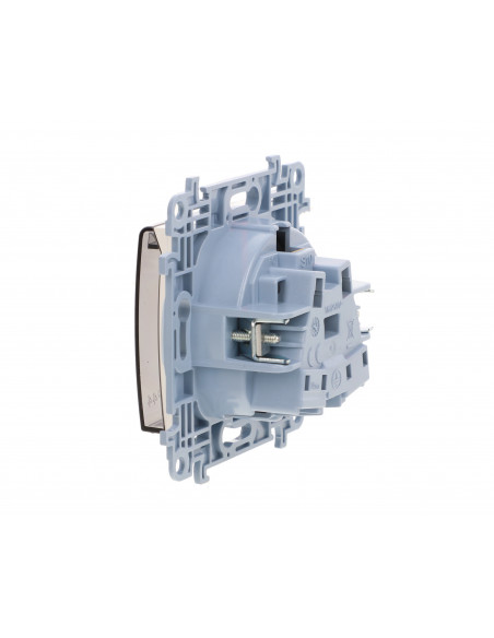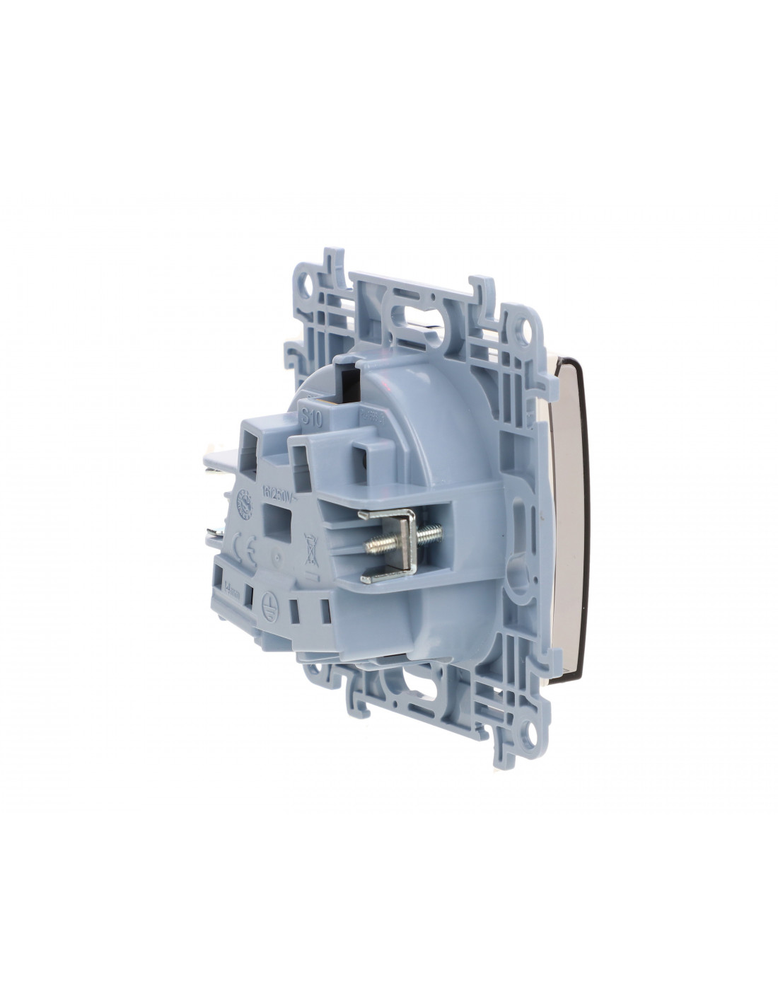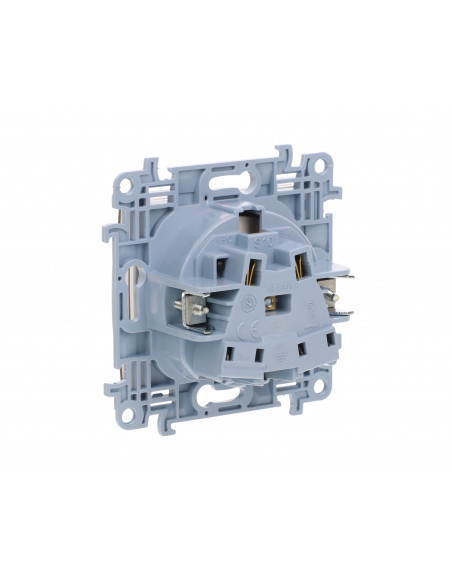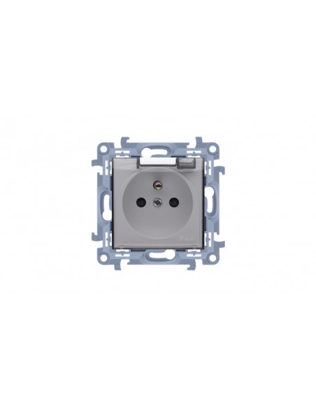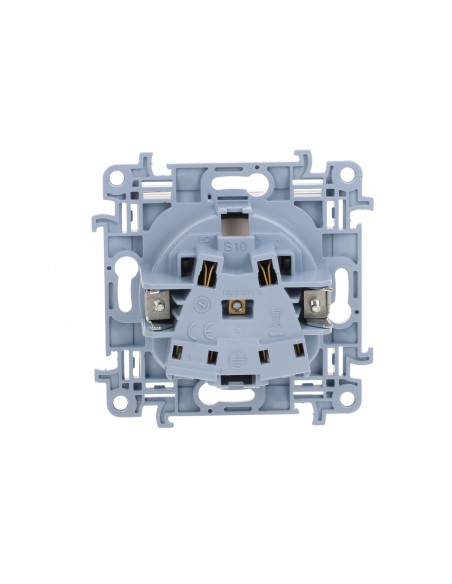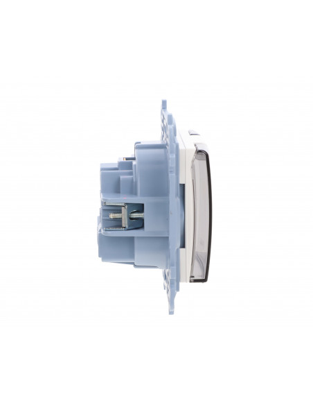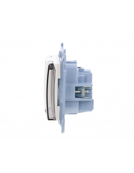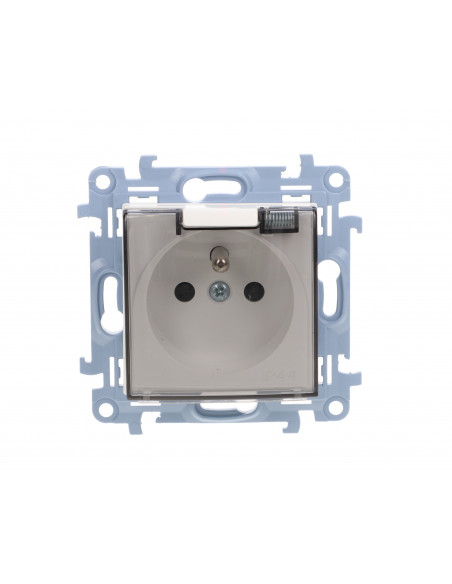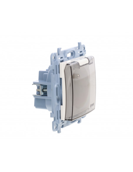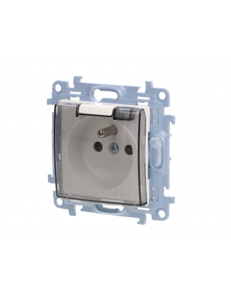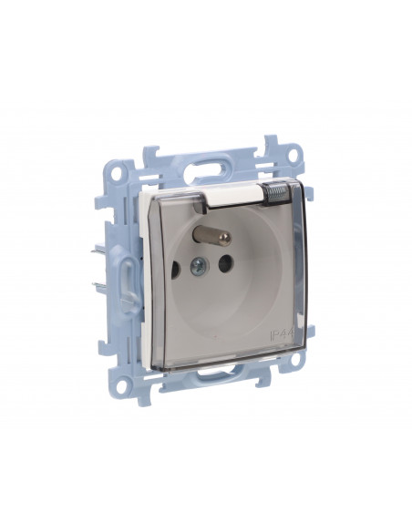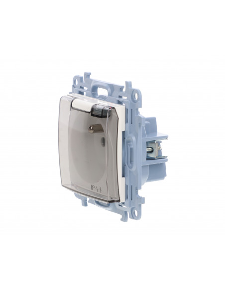 Simon 10 Gniazdo pojedyncze IP44 z uszczelką z przesłonami torów prąd. klapka w kolorze transparentnym, szybkozłącza, biały 16A.