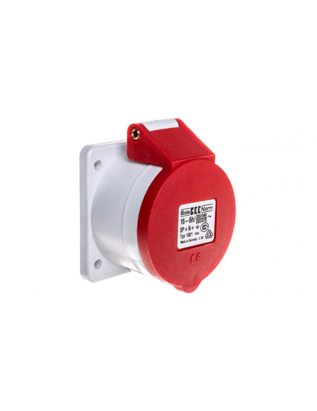 Gniazdo tablicowe proste 16A 3P+N+PE 200/346 do 240/415V 6h IP44 50 i 60Hz, Kołnierz i otwory montażowe: kołnierz 72x65 Otwory motażowe 52x52, Kolor indentyfikacyjny: czerwony RAL 3000, Izolator/Kontakty: Izolator z PA6 kontakty mosiężne, Przewód mm2 max 4,0 mm2, Obudowa PA6 RAL 7035 poliamid, materiał uszczelek: uszczelka kołnierzaTPE biała, elementy zewnętrzne elementy metalowe sprężyna klapki stal nierdzewna nity klapki mosiężny, Inne: klapka samozamykająca