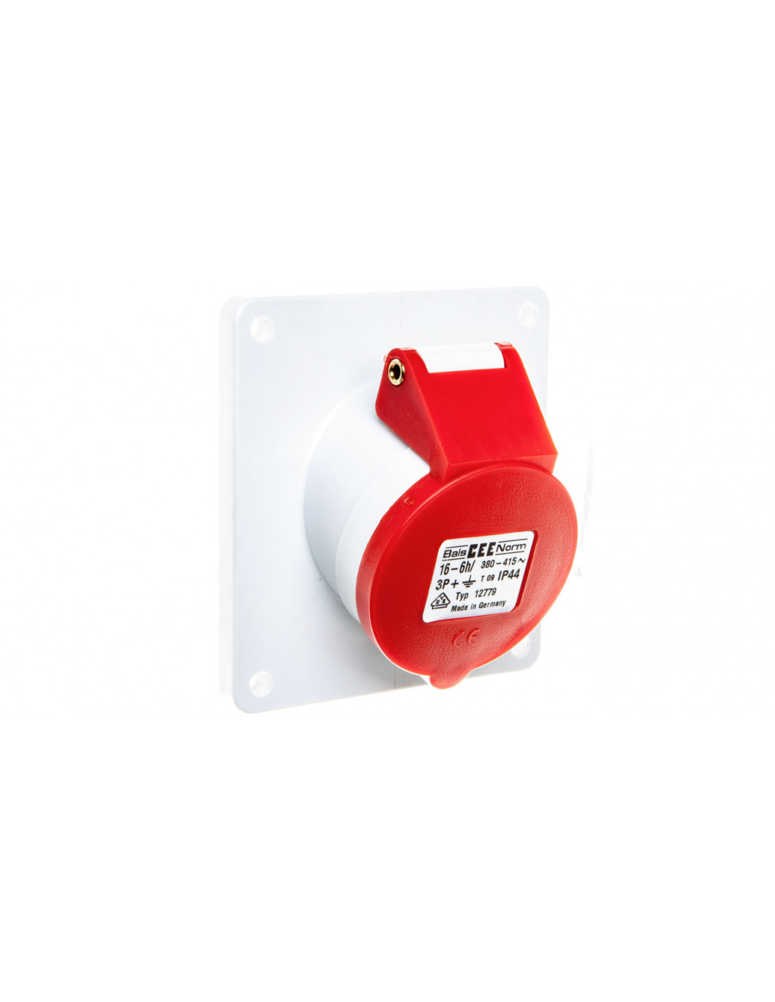 Gniazdo tablicowe Quick-Connect skośne 16A 3P+PE 380 do 415V 6h IP44 50 i 60Hz, Kołnierz i otwory montażowe: kołnierz 100x92 Otwory motażowe 85x77, Kolor indentyfikacyjny: czerwony RAL 3000, Izolator/Kontakty: Izolator z PA6 kontakty mosiężne, Przewód mm2 max 4,0 mm2, Obudowa PA6 RAL 7035 poliamid, materiał uszczelek: uszczelka kołnierzaTPE biała, elementy zewnętrzne elementy metalowe sprężyna klapki stal nierdzewna nity klapki mosiężny, Inne: skośne 20° klapka samozamykająca