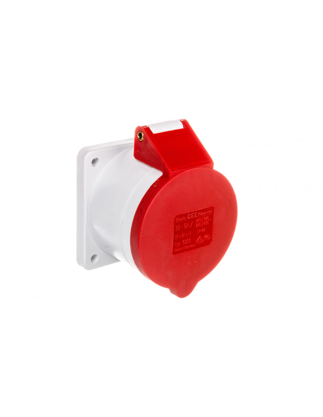 Gniazdo tablicowe proste 32A 3P+N+PE 200/346 do 240/415V 6h IP44 50 i 60Hz, Kołnierz i otwory montażowe: kołnierz 75x75 Otwory motażowe 60x60, Kolor indentyfikacyjny: czerwony RAL 3000, Izolator/Kontakty: Izolator z PA6 kontakty mosiężne, Przewód mm