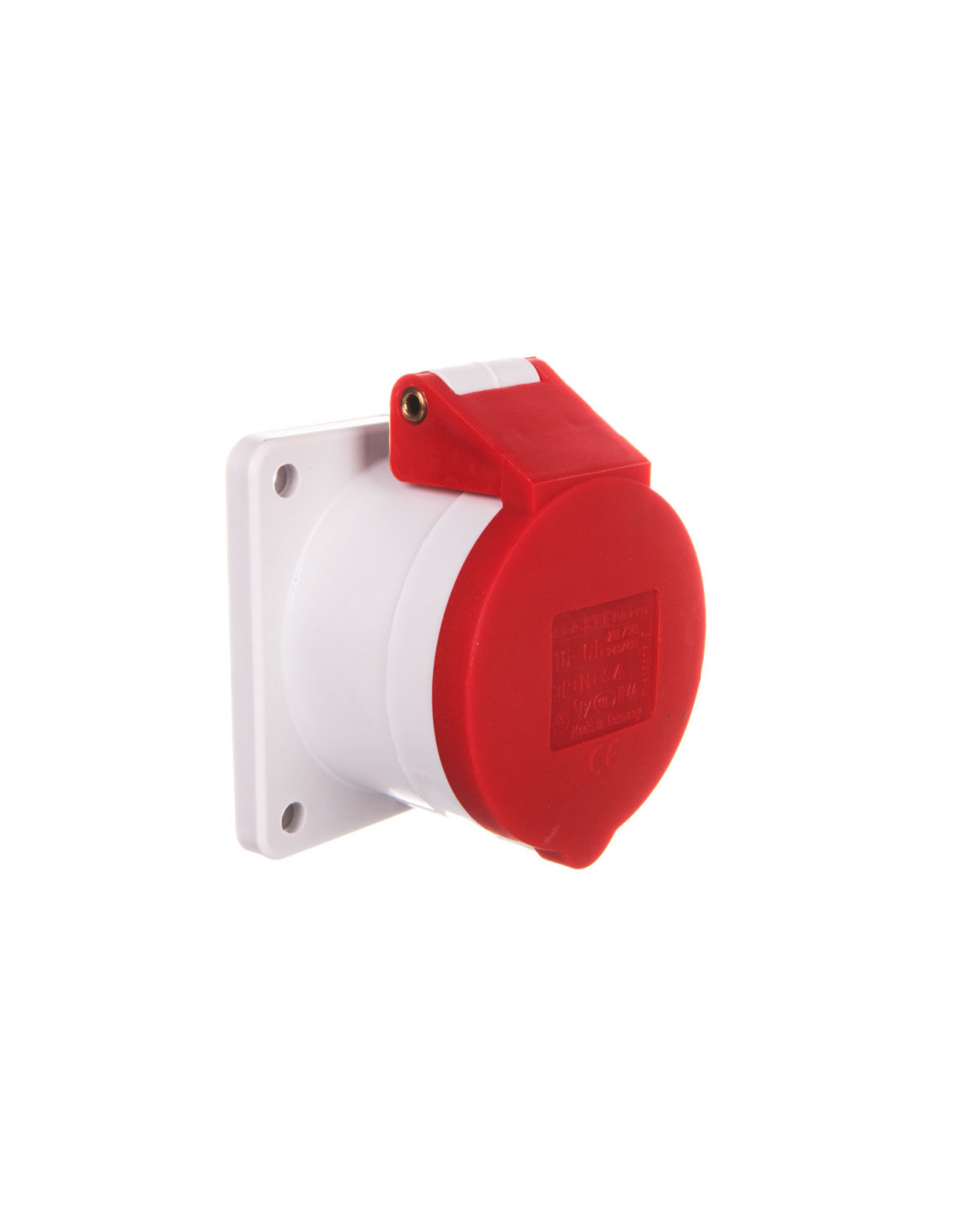 Gniazdo tablicowe proste 16A 3P+N+PE 200/346 do 240/415V 6h IP44 50 i 60Hz, Kołnierz i otwory montażowe: kołnierz 75x75 Otwory motażowe 60x60, Kolor indentyfikacyjny: czerwony RAL 3000, Izolator/Kontakty: Izolator z PA6 kontakty mosiężne, Przewód mm