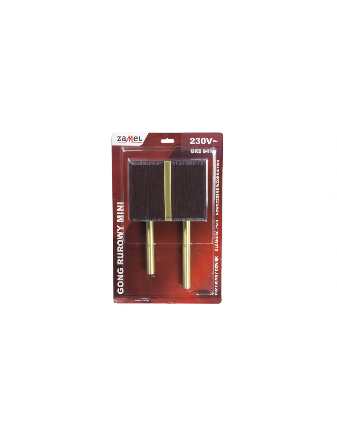 Gong elektromechaniczny,obudowa z tworzywa sztucznego,maskownica z drewna lub imitacji drewna (kolor rustical),dwie mosiężne rury generujące dźwięk,dźwięk: dwa tony – BIM-BAM (tony wyższe niż w gongu rurowym),poziom dźwięku: ok. 71 dB.