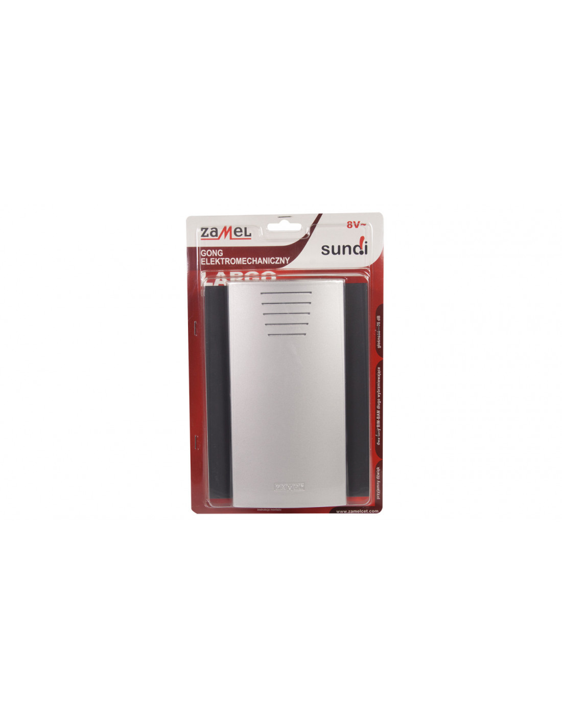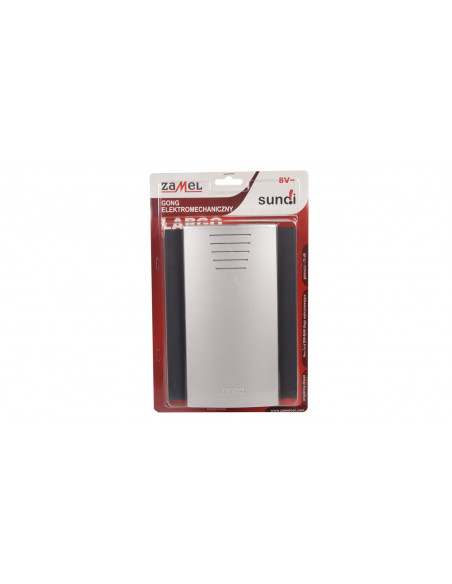 Gong elektromechaniczny,obudowa z tworzywa sztucznego (kolor czarny+srebrny metalik),dźwięk: dwa tony – BIM-BAM długo wybrzmiewające,poziom dźwięku: ok. 75 dB.