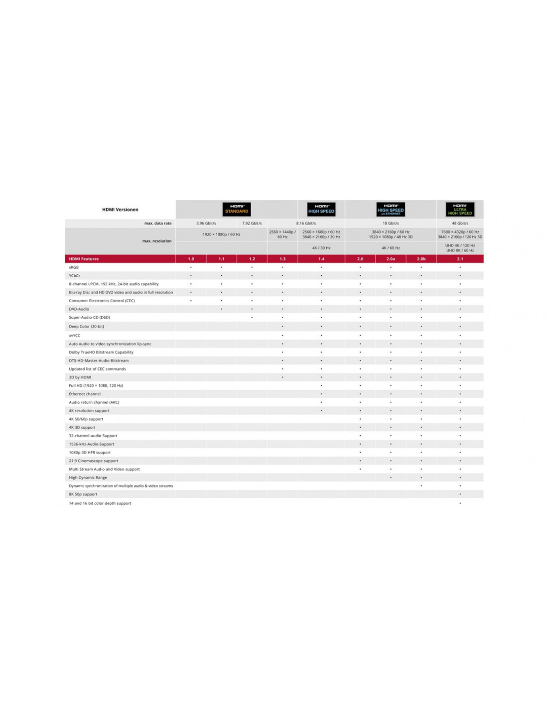 Transmisja sygnału o wysokiej rozdzielczości do 8K / 60Hz lub 4K / 120Hz (zgodna z poprzednimi wersjami). Ponadto kabel obsługuje wszystkie typowe funkcje, takie jak ARC (Audio Return Channel), HDCP lub 3D.