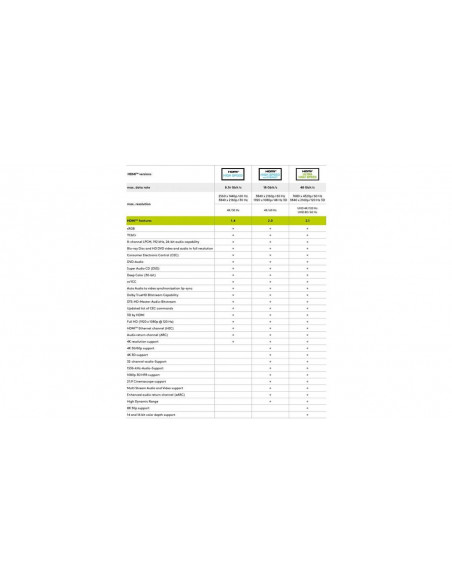 Inne standardy obsługiwane: HDR (High Dynamic Range), HDMI™ Ethernet Channel (HEC), 3D, HDCP 2.2, Consumer Electronics Control (CEC)