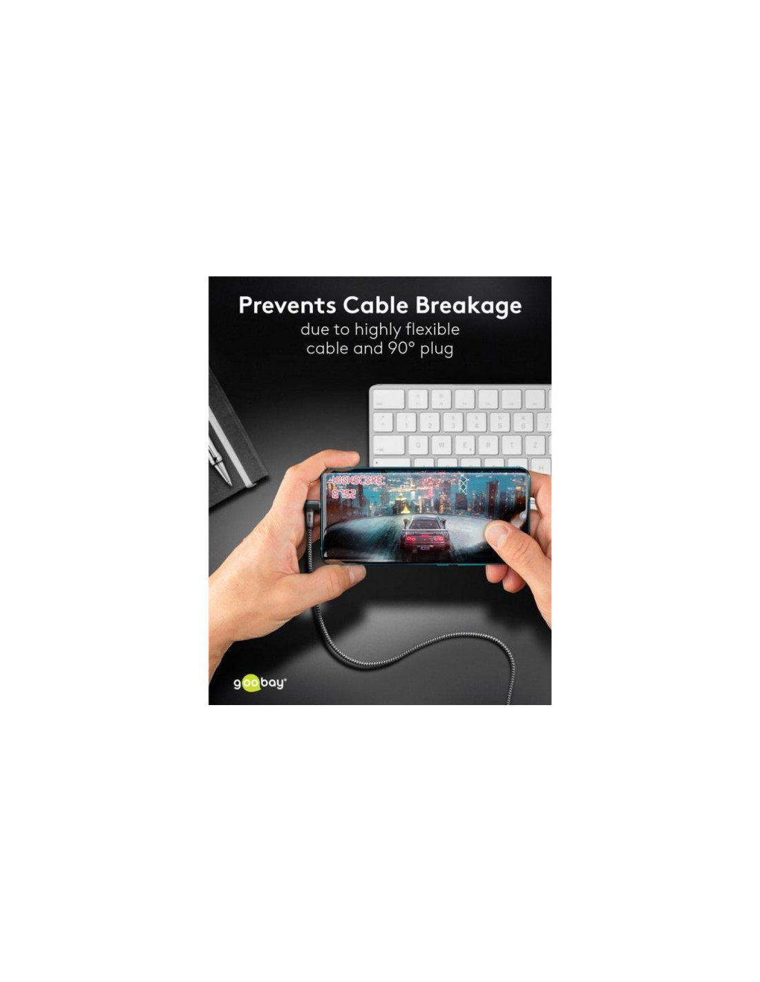 Kąt wtyczki 90° sprawia, że kabel leży równolegle do urządzenia, co skutecznie zapobiega jego złamaniu