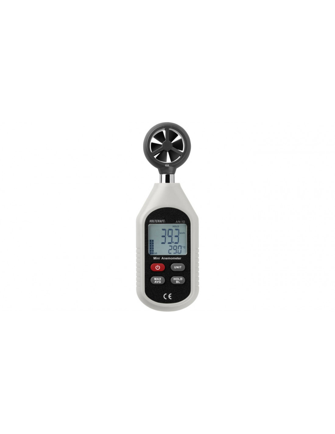 Poręczny miernik z wirnikiem skrzydełkowym, z magnetycznym odbiornikiem o niewielkich stratach, do pomiaru prędkości wiatru i prędkości przepływu gazów. Prędkość może być wyświetlana w pięciu różnych jednostkach (m / s, ft / min, km / h, mp / h i węzłach). Poza tym można ustalić i pokazać na podświetlanym wyświetlaczu prędkość średnią i maksymalną danego procesu pomiarowego.