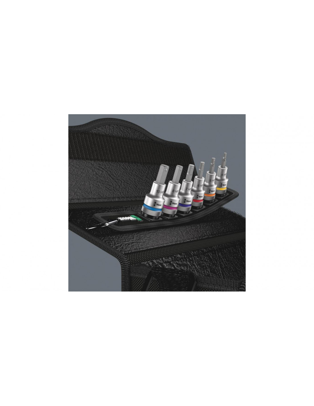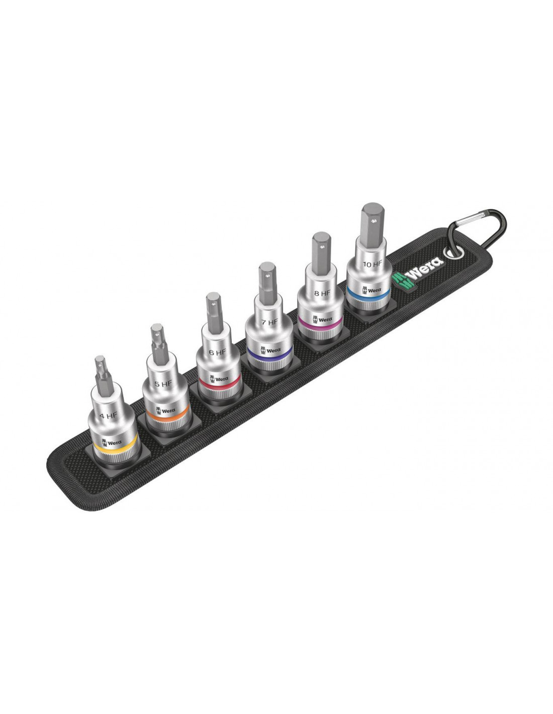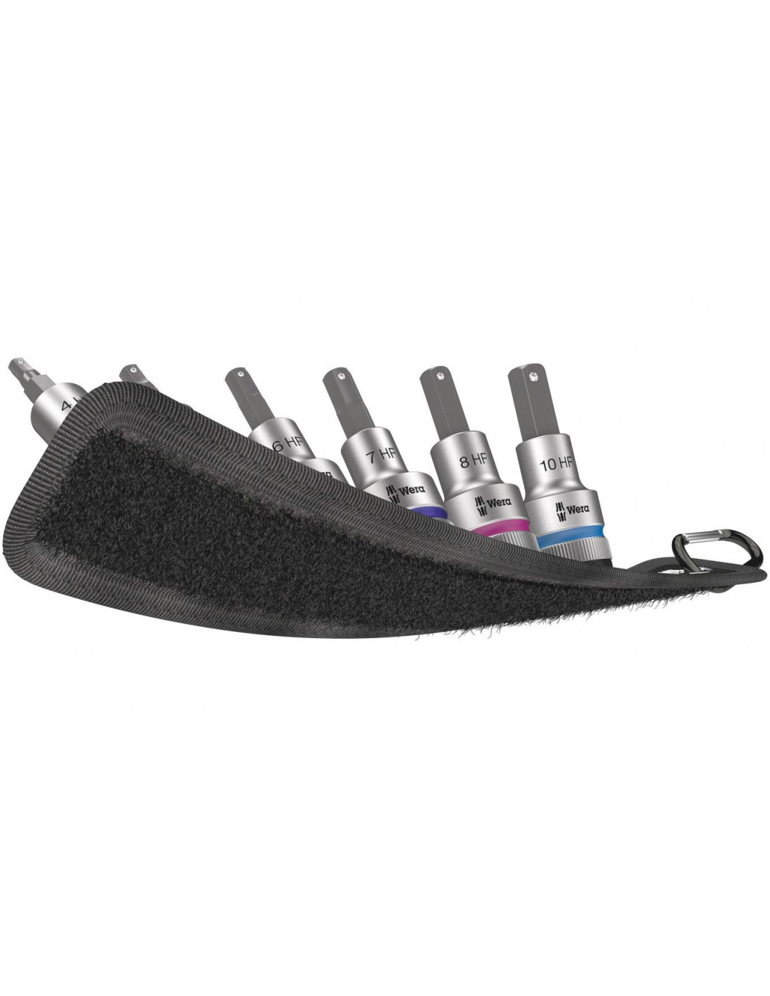 Wytrzymała zawieszka tekstylna wykonana w stylu charakterystycznym dla firmy Wera z 6 bitami nasadowymi i narzędziem do usuwania nakrętek do pracy w ograniczonych przestrzeniach. Płynnie działający mechanizm obrotowy dla pewnego mocowania i łatwego wyjmowania kluczy nasadowych. System oznaczenia kolorystycznego kluczy według rozmiaru "Take it easy" ułatwiający i przyspieszający odnajdywanie właściwego narzędzia. Wraz z metalowym karabińczykiem umożliwiającym mocowanie do szlufki lub torby. Wyjątkowo krótkie, stabilne bity nasadowe z zaletami technologii bitów Wera. Bity nasadowe z funkcją przytrzymywania umożliwiające wyjątkowo komfortową pracę bez ryzyka zgubienia śruby podczas zbliżania narzędzia do detalu. Wykonany z włókniny spód zawieszki oraz rzepy ułatwiają mocowanie np. do ściany, półki, wózka warsztatowego i elementów systemu do transportu narzędzi Wera 2go.