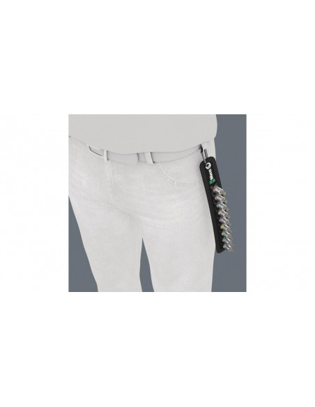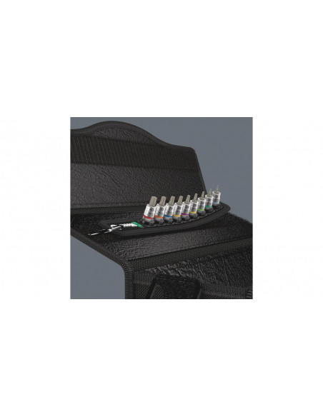 Wytrzymała zawieszka tekstylna wykonana w stylu charakterystycznym dla firmy Wera z 9 bitami nasadowymi i narzędziem do usuwania nakrętek do pracy w ograniczonych przestrzeniach. Płynnie działający mechanizm obrotowy dla pewnego mocowania i łatwego wyjmowania kluczy nasadowych. System oznaczenia kolorystycznego kluczy według rozmiaru "Take it easy" ułatwiający i przyspieszający odnajdywanie właściwego narzędzia. Wraz z metalowym karabińczykiem umożliwiającym mocowanie do szlufki lub torby. Wyjątkowo krótkie, stabilne bity nasadowe z zaletami technologii bitów Wera. Bity nasadowe z funkcją przytrzymywania umożliwiające wyjątkowo komfortową pracę bez ryzyka zgubienia śruby podczas zbliżania narzędzia do detalu. Wykonany z włókniny spód zawieszki oraz rzepy ułatwiają mocowanie np. do ściany, półki, wózka warsztatowego i elementów systemu do transportu narzędzi Wera 2go.