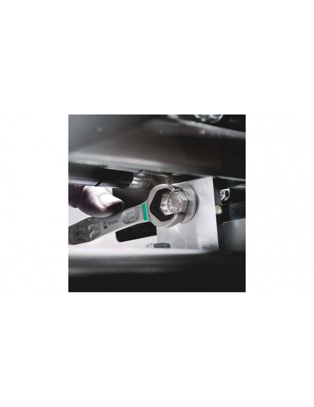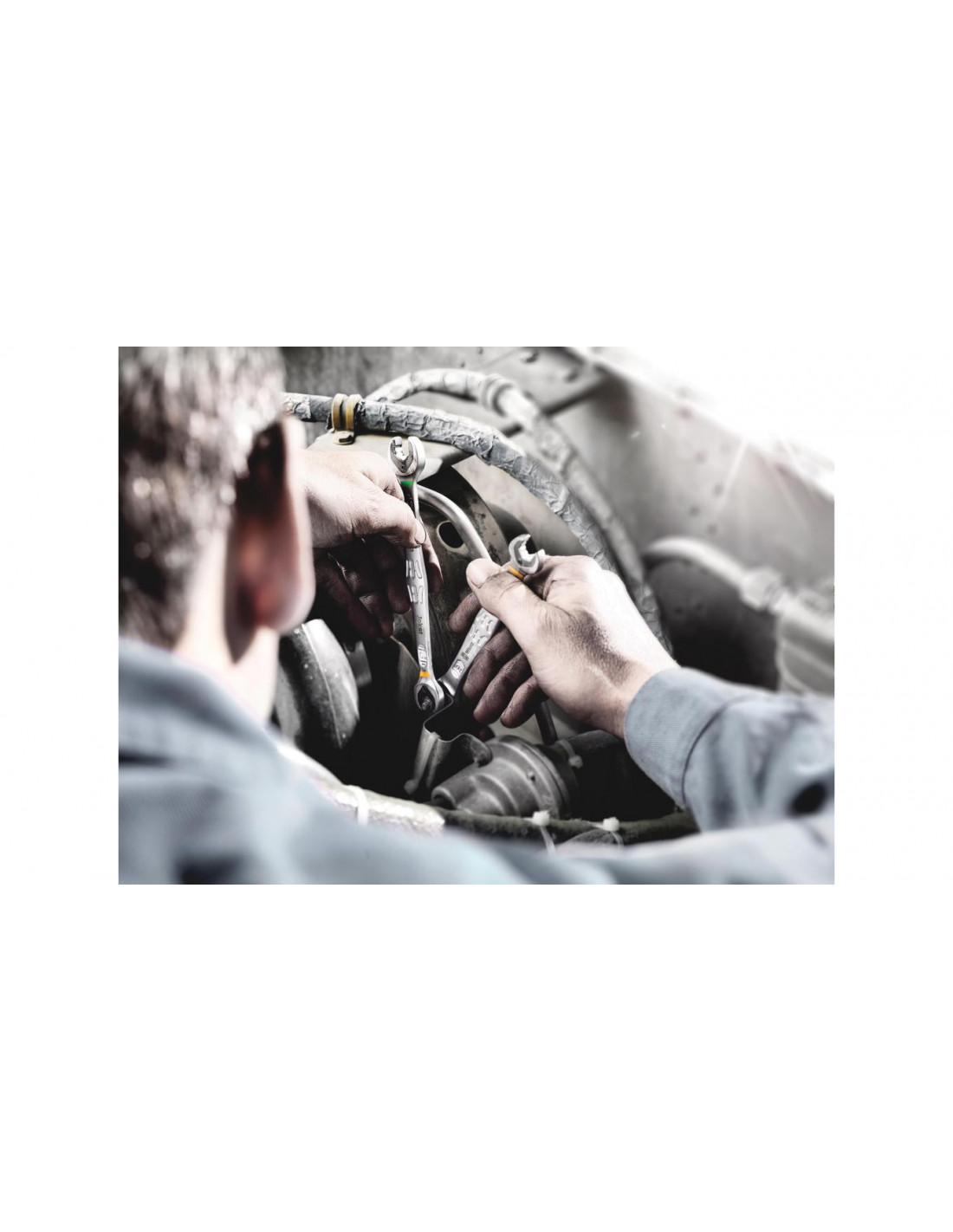 Wysokiej jakości metryczny klucz płasko-oczkowy z grzechotką firmy Wera: wszystko, co powinien zapewnić klucz. I jeszcze więcej. Szybciej, lepiej, bezpieczniej. Tak właśnie działa Joker. Nowa generacja kluczy płaskich z mechanizmem zapadkowym. Do śrub i nakrętek z łbem sześciokątnym. Funkcja przytrzymywania z metalową płytką zmniejszającą ryzyko zgubienia śruby lub nakrętki. Bardzo twarde ząbki wymiennej płytki pewnie chwytają śruby i nakrętki oraz zmniejszają ryzyko ześlizgiwania się klucza. Wbudowany ogranicznik zapobiega ześlizgiwaniu się klucza z łba śruby i umożliwia przenoszenie wysokich momentów obrotowych. Podwójny profil sześciokątny zapewnia doskonałe połączenie kształtowe między kluczem a śrubą bądź nakrętką, zmniejszając tym samym ryzyko ześlizgiwania. Przesuwanie klucza co 30° eliminuje czasochłonne obracanie klucza. Drobnozębny mechanizm zapadkowy z 80 zębami zapewnia maksymalną elastyczność nawet w wąskich przestrzeniach. Przenoszenie wysokich momentów obrotowych i podwyższona wytrzymałość na zginanie dzięki specjalnej geometrii. Wykonany z wysokiej jakości stali chromowo-molibdenowej z powłoką chromowo-niklową dla ochrony przed korozją. System wyszukiwania narzędzi Wera "Take it easy": system oznaczenia kolorystycznego kluczy według rozmiaru.