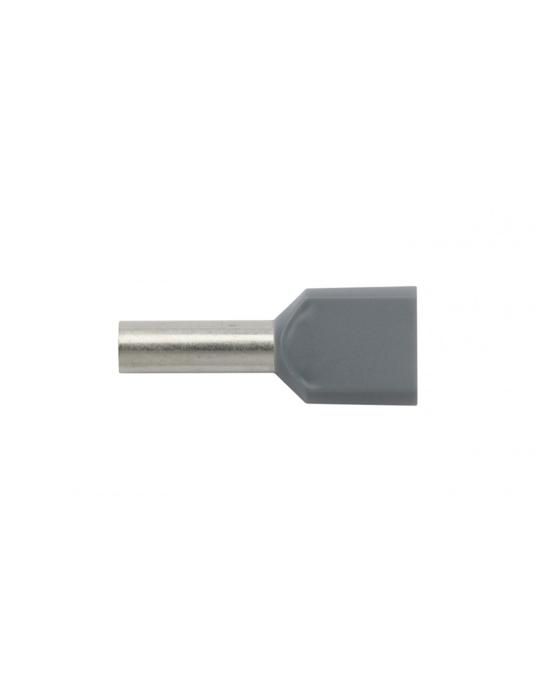 Podwójna końcówka tulejkowa izolowana w kolorze szarym. Montaż poprzez zaciskanie końcówki kablowej tego typu pozwala na łączenie przewodów wielodrutowych z kolejnymi elementami instalacji elektrycznej. Stosowanie końcówki tulejkowe chroni również przed występowaniem awarii powodowanych przez drucik obluzowany w wyniku wstrząsów.
