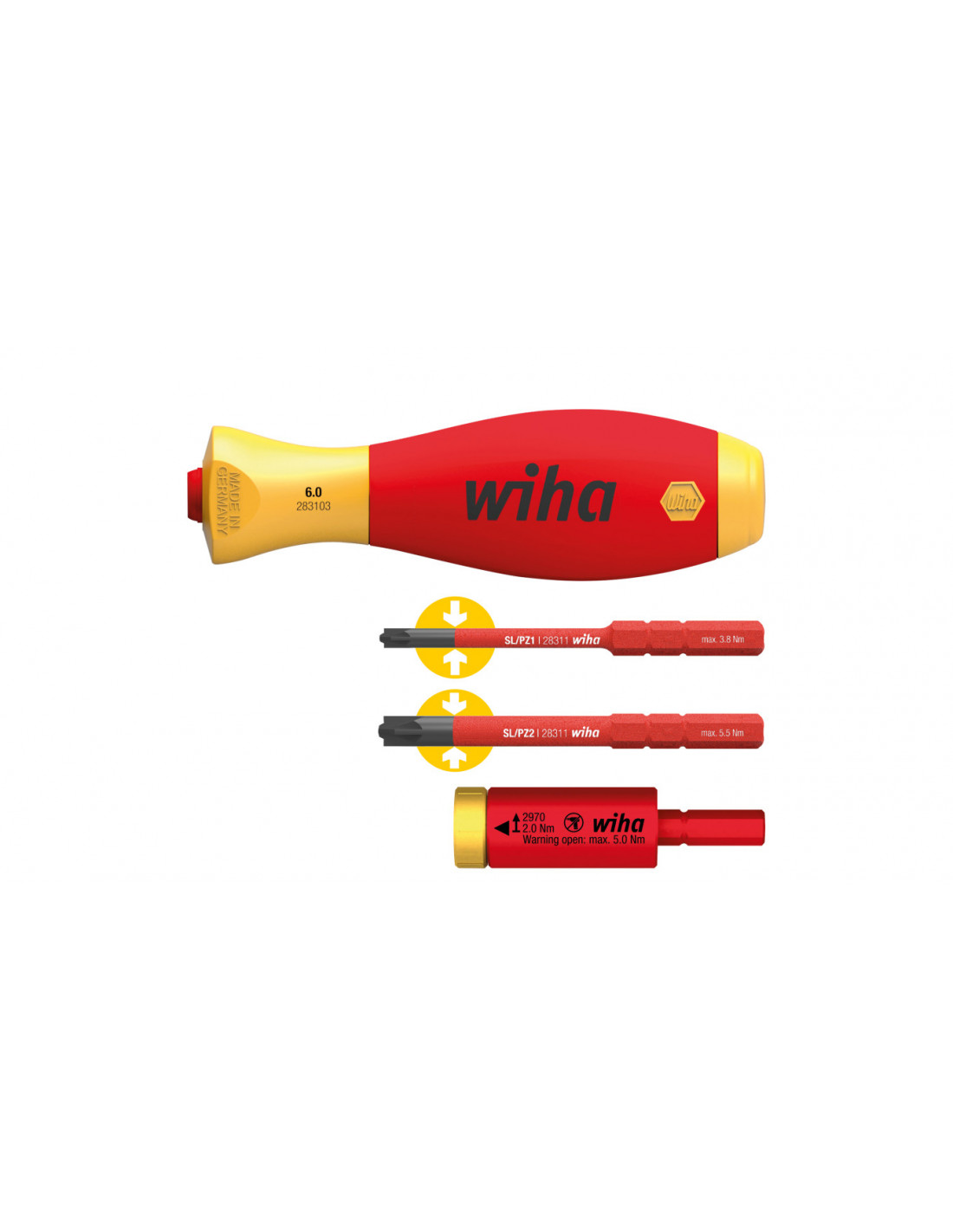 Nizsze koszty : Wlasciwy moment dokrecania chroni przed roszczeniami gwarancyjnymi. Wyzsza efektywnosc pracy : Wlasciwy moment dokrecania chroni przed uszkodzeniami materialu i kosztownymi poprawkami.100% kompatybilnosci z systemem Wiha slimBit. Pelna ochrona : Kazde narzedzie testowane pojedynczo napieciem 10 000 V AC i dopuszczone do uzycia pod napieciem 1000 V AC. Adapter easyTorque umozliwia kontrolowane dokrecanie srub, jak równiez zapewnia bezpieczenstwo podczas prac przy instalacjach elektrycznych. Stosowanie adaptera dynamometrycznego zapewnia bezpieczenstwo procesu technologicznego, a tym samym chroni material przed uszkodzeniem i dodatkowa obróbka wykanczajaca. Ponadto izolowany zestaw adapterów easyTorque posiada niezawodny uchwyt do bitów slimBit o wielkosci 75 mm i jest kompatybilny z wszystkimi produktami slimVario. Tym samym przy uzyciu tego porecznego adaptera mozna w jednej chwili przeksztalcic w narzedzie dynamometryczne zarówno srubokret slimVario z uchwytem na bity i wkretak slimVario Stubby electric, jak i srubokret LiftUp electric z magazynkiem bitów. Uzyskanie momentu dokrecania jest sygnalizowane przez slyszalne klikanie oraz wizualnie przez obrót zóltego pierscienia i czerwonego adaptera w przeciwna strone. Przy dokladnosci zadzialania +/- 10% to narzedzie dynamometryczne spelnia wymogi normy DIN EN ISO 6789. Zestaw adapterów easyTorque poddawany jest kontroli jednostkowej zgodnie z miedzynarodowa norma IEC 60900 i umozliwia bezpieczna prace przy czesciach znajdujacych sie pod napieciem do 1000 V AC. Normy : Produkowany zgodnie z IEC 60900. Zastosowanie : Sluzy on do kontrolowanego wykonywania polaczen srubowych w obszarze czesci znajdujacych sie pod napieciem do 1000 V AC, np. bezpieczników samoczynnych. 1 x Adapter dynamometryczny easyTorque electric do bitów slimBit i uchwytu SlimVario®, w opakowaniu blistrowym (41342) 2,0 Nm 1 x Bit slimBit electric PlusMinus/Pozidriv (34589) SL/PZ1 x 75 mm 1 x Bit slimBit electric PlusMinus/Pozidriv (34590) SL/PZ2 x 75 mm 1 x Wkretak z uchwytem SoftFinish electric