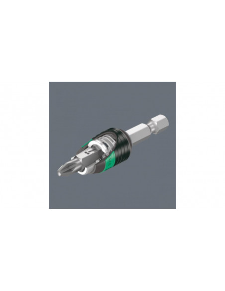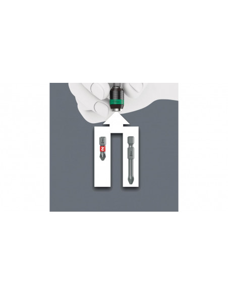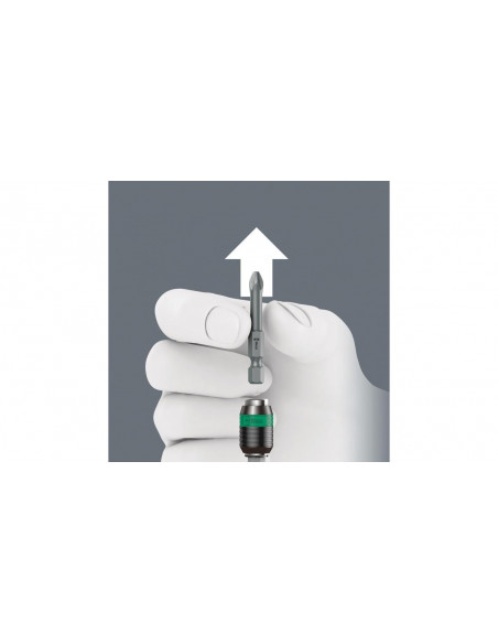 Uchwyt uniwersalny Rapidaptor do grotów sześciokątnych 1/4" wg DIN ISO 1173-C 6,3 oraz końcówek E 6,3 (ISO 1173). Możliwość zamocowania grotu lub końcówki bez konieczności przesuwania pierścienia przytrzymującego. Wymiana grotu lub końcówki następuje poprzez przesunięcie pierścienia przytrzymującego do przodu, co pozwala na szybką obsługę jedną ręką. Chwyt sześciokątny 1/4", do wkrętarek z uchwytem wg DIN ISO 1173-F 6,3.