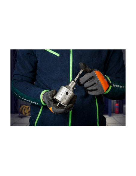 Otwornica widiowa 65 mm z adapterem SDS+ oraz wiertłem pilotującym 55H321 marki GRAPHITE charakteryzująca się średnicą otwornicy 65 mm, wysokością 72 mm i głębokością wiercenia 50 mm. Wyposażona została w 8 widii o szerokości 2,2 mm. Średnica wewnętrzna wynosi 59 mm, a parametry wiertła fi to 8 x 110 mm. Długość całego zestawu to 163 mm. Otwornica marki GRAPHITE oferowana jest w zestawie z adapterem SDS+ oraz wiertłem pilotującym. Posiada możliwość wiercenia z udarem i przeznaczona jest również do wiercenia otworów w betonie i cegle. Umożliwia przygotowywanie otworów pod puszki instalacyjne. Ostrza z drobnoziarnistego węglika spiekanego o zwiększonej odporności na ścieranie przedłużają żywotność narzędzia.