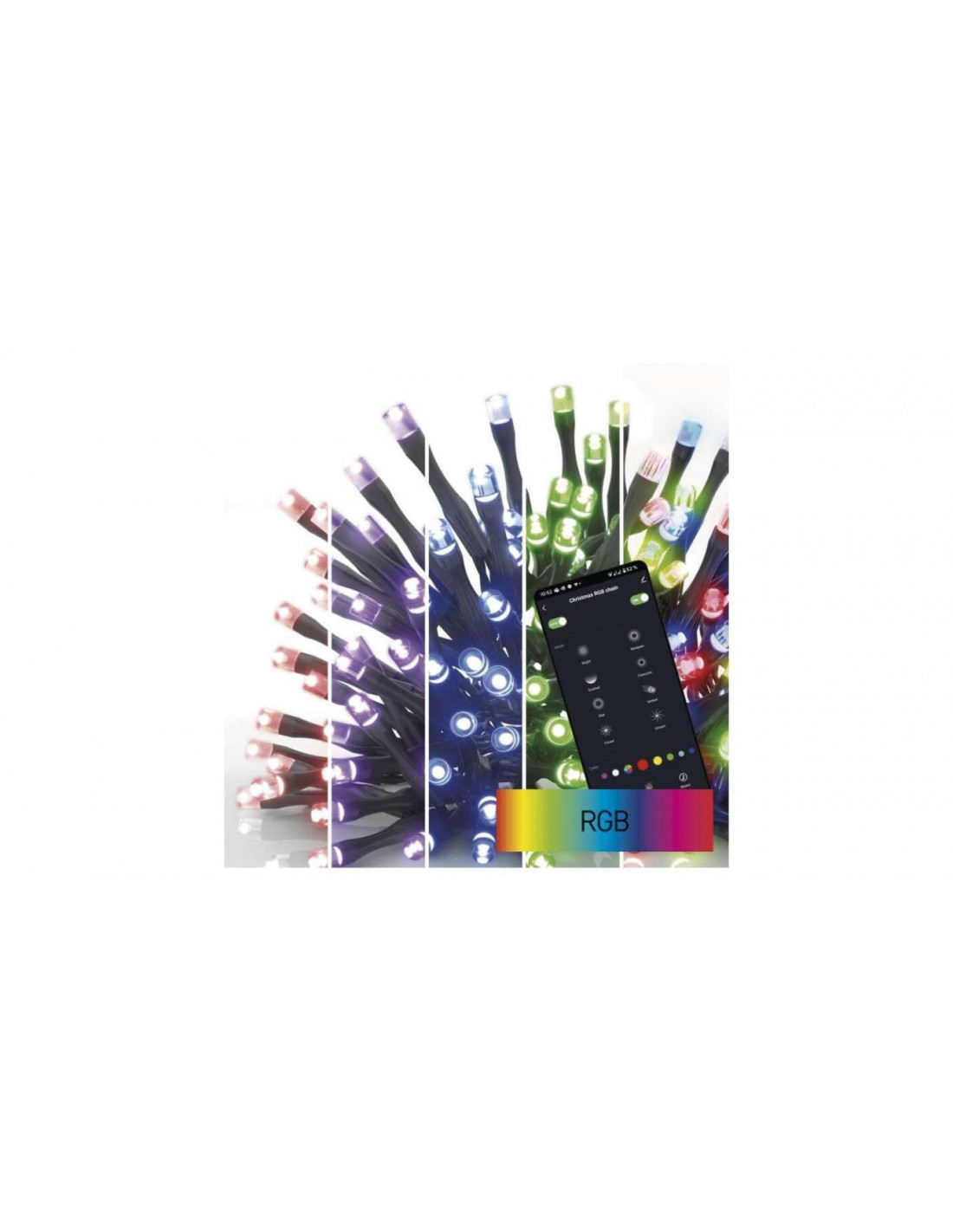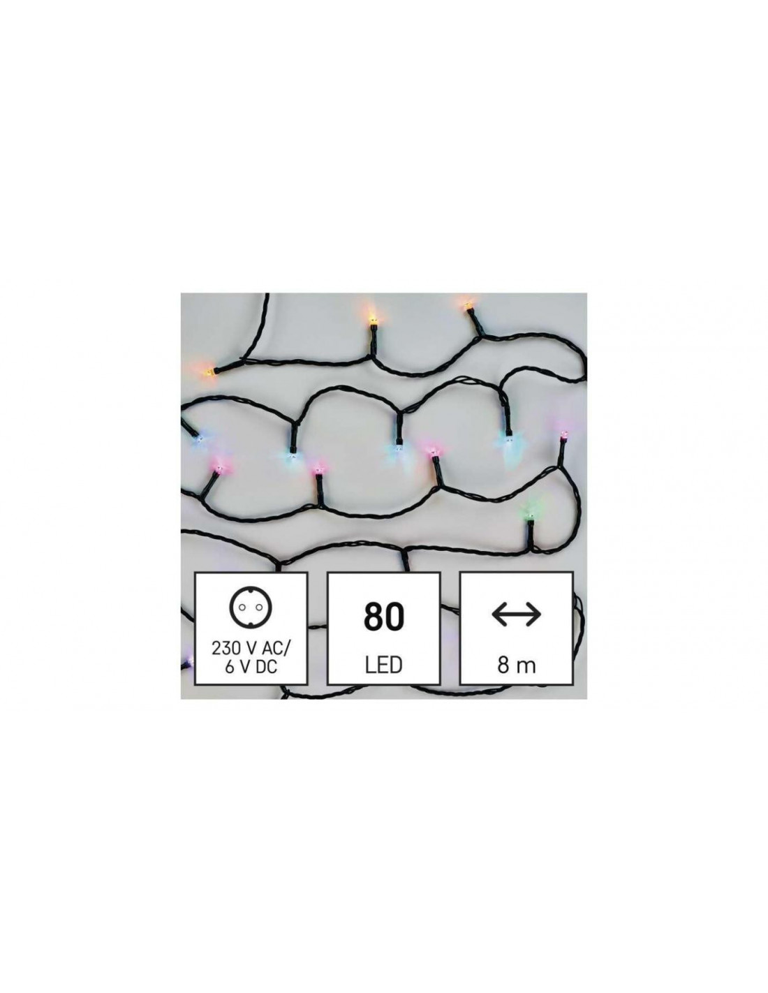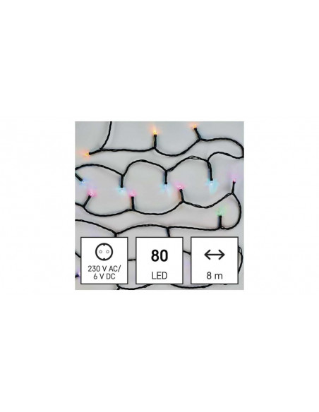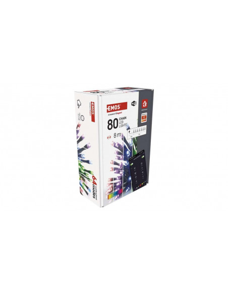 produkt: łańcuch, barwa światła: RGB, wymiary: 8 m, zastosowanie: zewnętrzne i wewnętrzne, timer, pilot zdalnego sterowania: nie, funkcje: 64 trybów (multifunkcja), typ zasilania: zasilacz sieciowy, ilość LED: 80, długość przewodu: 5 m, do wysokości choinki: nie dotyczy, kolor przewodów: czarny, moc: 8,4 W, napięcie wejściowe: 230 V AC, napięcie wyjściowe: 6 V DC, możliwość podłączenia: nie, stopień ochrony: IP44, żywotność: 10 000 godzin, materiał: PVC, okres gwarancyjny: 2 lata, opakowanie: 1 szt., pudełko
