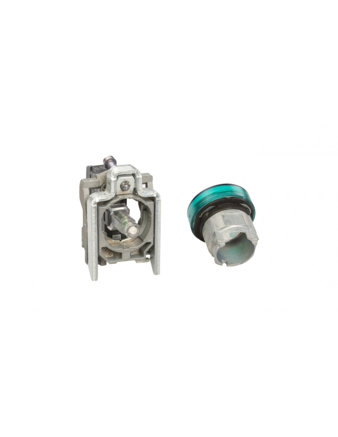Lampka sygnalizacyjna należy do serii produktów XB4 firmy Schneider Electric. Produkt wyposażony został w gładką, zieloną soczewkę “Protected LED”. Wskaźnik posiada kołnierz mocujący wykonany z zamaku. Znamionowe napięcie zasilania wynosi od 230 do 240 V. Produkt ma zaciski śrubowe, jeden z końcówką kablową, drugi bez. Zużywa 14 mA prądu i pracuje 100 000 h przy napięciu znamionowym i temperaturze 25°C.