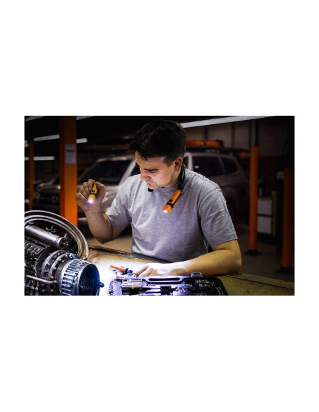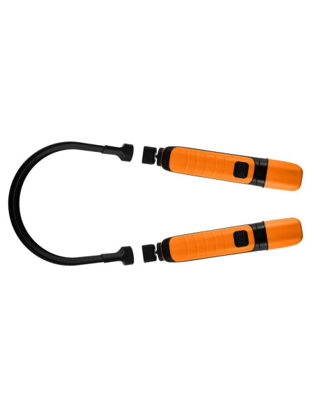 Lampa na szyję 300 lm 99-112 marki NEO TOOLS to lampa z podwójnym źródłem światła o mocy 2W + 2W. Funkcjonująca w oparciu o baterię litowo-jonową 3,7 V o pojemności 2x 1200 mAh. Lampa NEO TOOLS oferuje intensywność świecenia na poziomie 300 lm (z czasem pracy 3 godziny) oraz 50 lm (z czasem pracy od 5 do 6 godzin). Czas ładowania wynosi zaledwie 3 godziny. Urządzenie charakteryzuje się możliwością odczepiania lamp i zastosowania ich jako latarek. Wykonane z trwałego ABS, posiada klasę wodo i pyłoszczelności IP20, a także klasę wytrzymałości mechanicznej IK07. Lampa wyróżnia się ochroną przed przeładowaniem i rozładowaniem. Magnes w obu lampach umożliwia mocowanie jej na dowolnej powierzchni metalowej, a gumowy pasek ułatwia użytkowanie. Lampa na szyję NEO TOOLS oferowana jest w zestawie z przewodem USB C o długości 60 cm.