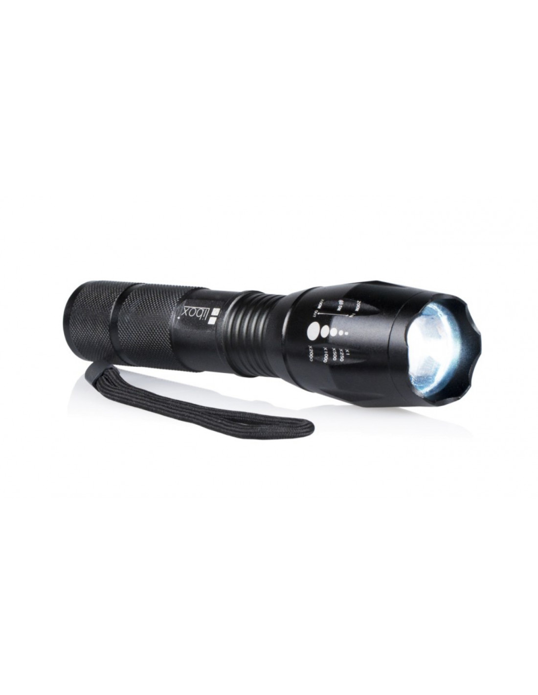 Latarka Libox Taktyczna T6 z funkcją ZOOM -wytrzymała obudowa z aluminium lotniczego -odporna na zachlapania oraz deszcz Właściwości: -wysokiej jakości dioda LED T6 o max strumieniu świetlnym 1000 LM -obudowa latarki wykonana ze stopu aluminium odpornego na zarysowania -odporna na działanie deszczu -funkcja ZOOM pozwala na dostosowanie szerokości wiązki światła -wygodny przycisk z tyłu obudowy pozwala na włączanie i wyłączanie latarki oraz wybór jednego z pięci trybów świecenia Specyfikacja: -żywotność diody LED: 100 000 godzin -strumień świetlny: 1000 LM -wykonana ze stopu aluminium -zasięg: do 800 metrów -ZOOM: x1, x250, x500x, x1000, x2000 -tryby świecenia: pełna moc, średnia moc, tryb oszczędny, pulsacyjny, SOS -czas ładowania: 6-8 godzin -waga: 134g Zawartość opakowania: - taktyczna latarka LED T6 z funckją ZOOM -adapter do baterii AAA ( brak baterii AAA w zestawie) -plastikowa osłona akumulatora 18650 akumulator Li-ion 18650 -ładowarka akumulatora