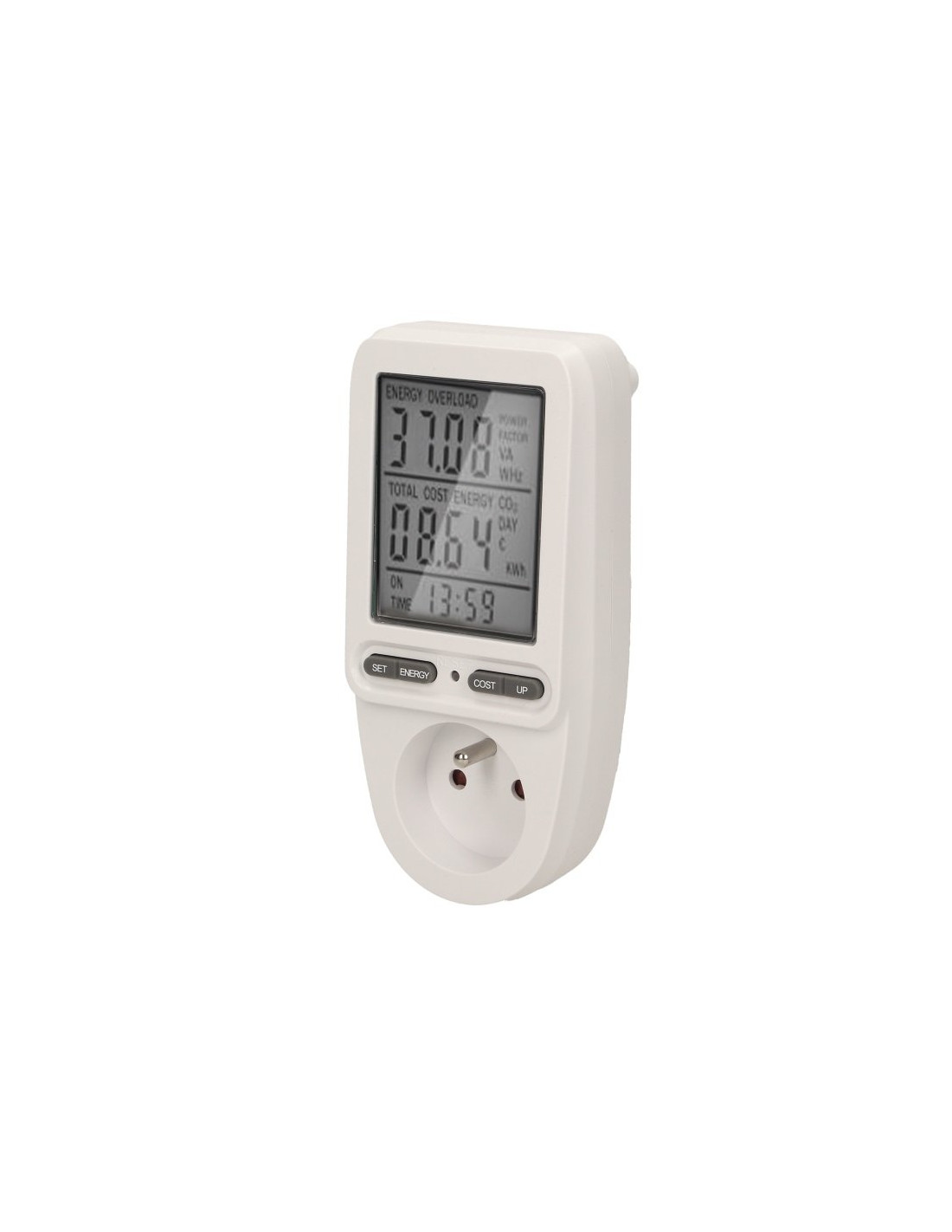 Watomierz umożliwia nam sprawdzenie zużycia prądu elektrycznego i obliczenie kosztów zużytej energii podłączonego urządzenia. Duży wyświetlacz LCD pokazuje dodatkowo: napięcie sieci, prąd w obwodzie, częstotliwość prądu, współczynnik mocy POWER FACTOR, moc podłączonego obciążenia, całkowite zużycie energii kWh, koszt zużytej energii, programowalną cenę 1kWh, łączny czas pomiaru zużycia energii od 0 sek. do 9999 dni, uśrednioną wagę emisji CO2 przy wytworzeniu energii pobranej. Pomiar napięcia: 150V~ 276V~.
