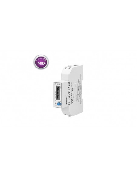 Urządzenie do dokonywania wskazań w jednostkach metrycznych (kWh), służy do bezpośredniego pomiaru mocy czynnej w układzie jednofazowym. Specjalny układ elektroniczny pod wpływem przepływającego prądu i przyłożonego napięcia generuje impulsy w ilości proporcjonalnej do pobieranej energii elektrycznej. Pobór energii w fazie sygnalizowany jest miganiem diody LED. Liczba impulsów jest przeliczana na energię pobraną, a jej wartość wskazywana jest przez wyświetlacz LCD (5+1). Zasilanie: 230V~, 50Hz, prąd bazowy: 5A, max. prąd: 100A, min. prąd: 0,25A, częstotliwość impulsów: 1000 imp/kWh, klasa dokładności B, obudowa o szerokości jednego modułu, montaż na szynie DIN TH-35 mm. Pomiar energii jest wykonywany zgodnie z normami EN50470-1:2006, EN50470-3:2006 Dyrektywy MID 2014/32/EU. Licznik jest dwukierunkowy czyli zlicza również energię wyprodukowaną przez odbiorcę.