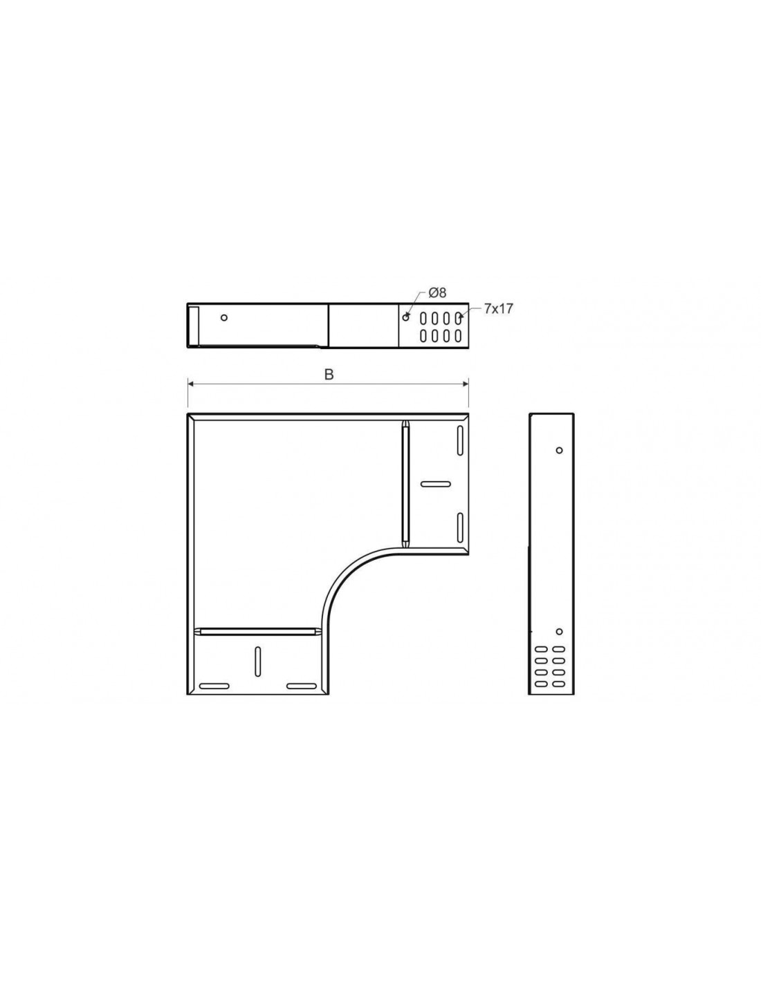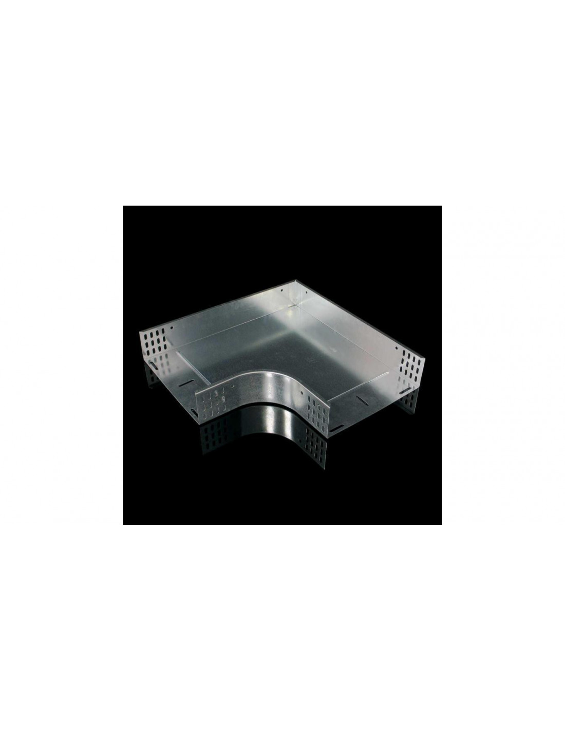 Kolanko do rozgałęzienia trasy kablowej w kierunku poziomym pod kątem 90° dla korytka kablowego o wymiarach 60x300 mm, obróbka powierzchniowa sendzimir, bezpośrednie połączenie z korytkiem kablowym bez konieczności stosowania złączki