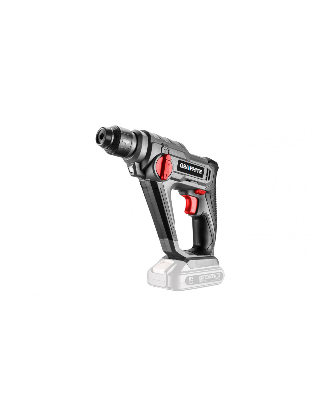 Młotowiertarka SDS+ GRAPHITE, współpracująca z akumulatorami 18V Li-Ion GRAPHITE Energy+. Posiada 2 funkcje: wiercenie oraz wiercenie z udarem elektro-pneumatycznym. Konstrukcja młotowiertarki odznacza się kompaktowym kształtem, zbliżonym do wymiarów wiertarko-wkrętarki oraz niską wagą. Elektronarzędzie zapewnia energię udaru 0.8J, optymalną także dla wiercenia w twardszych materiałach budowlanych. Częstotliwość udaru wynosi 0-5000 min,a prędkość obrotowa 0-900 min. Maksymalna średnica wiercenia w betonie wynosi 10 mm, w stali 8 mm, w drewnie 16mm. Młotowiertarka posiada możliwość zmiany kierunku obrotów wrzeciona oraz możliwość stopniowej regulacji prędkości za pomocą przycisku włącznika. Miejsce pracy jest doświetlane za pomocą diody LED. Młotowiertarka posiada funkcję "click" do szybkiego mocowania wiertła. Rękojeść główna pokryta jest antypoślizgową nakładką, dzięki czemu elektronarzędzie pewnie leży w dłoni.