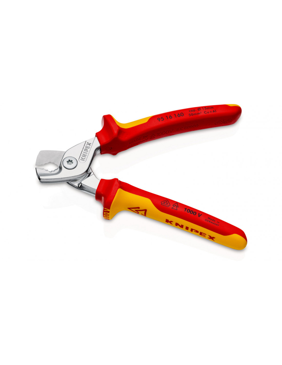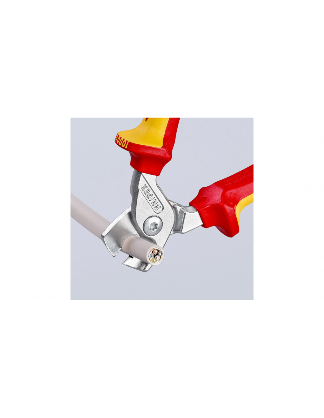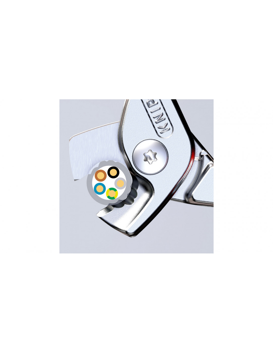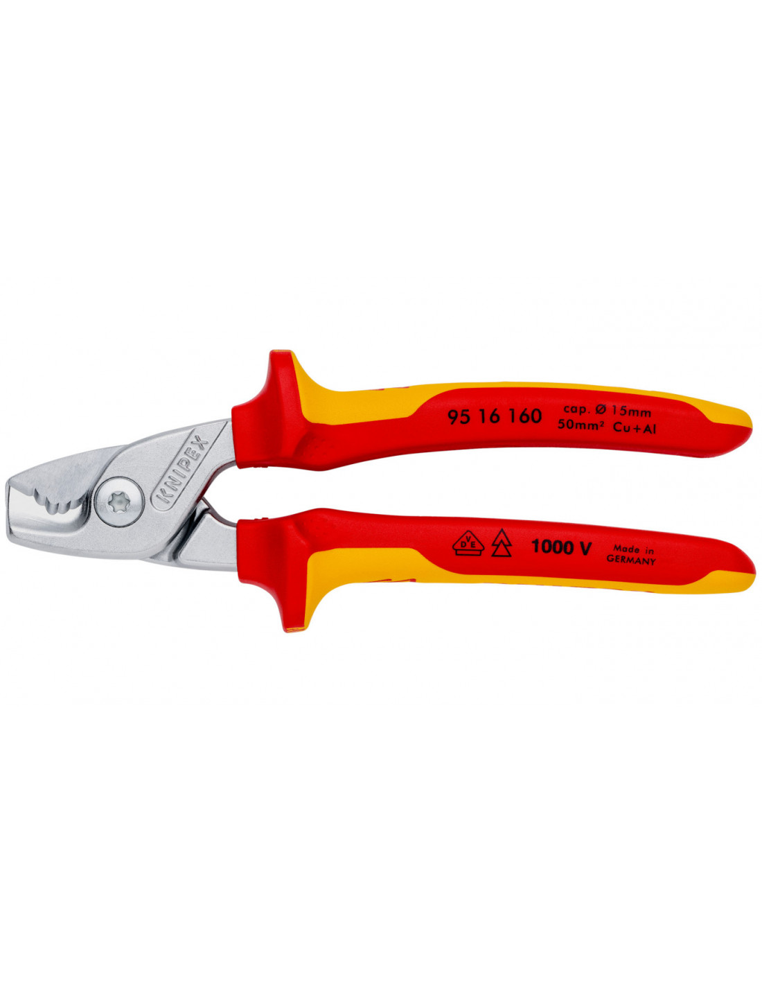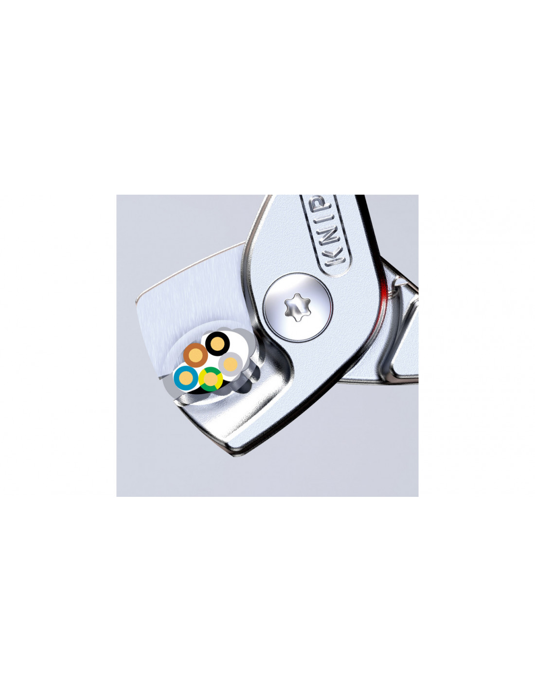 Znacznie mniejszy wysiłek: stopniowane krawędzie tnące płynnie oddzielają żyły; wymagana siła cięcia jest o 40% mniejsza niż w przypadku standardowych nożyc do kabli o tej samej długości!