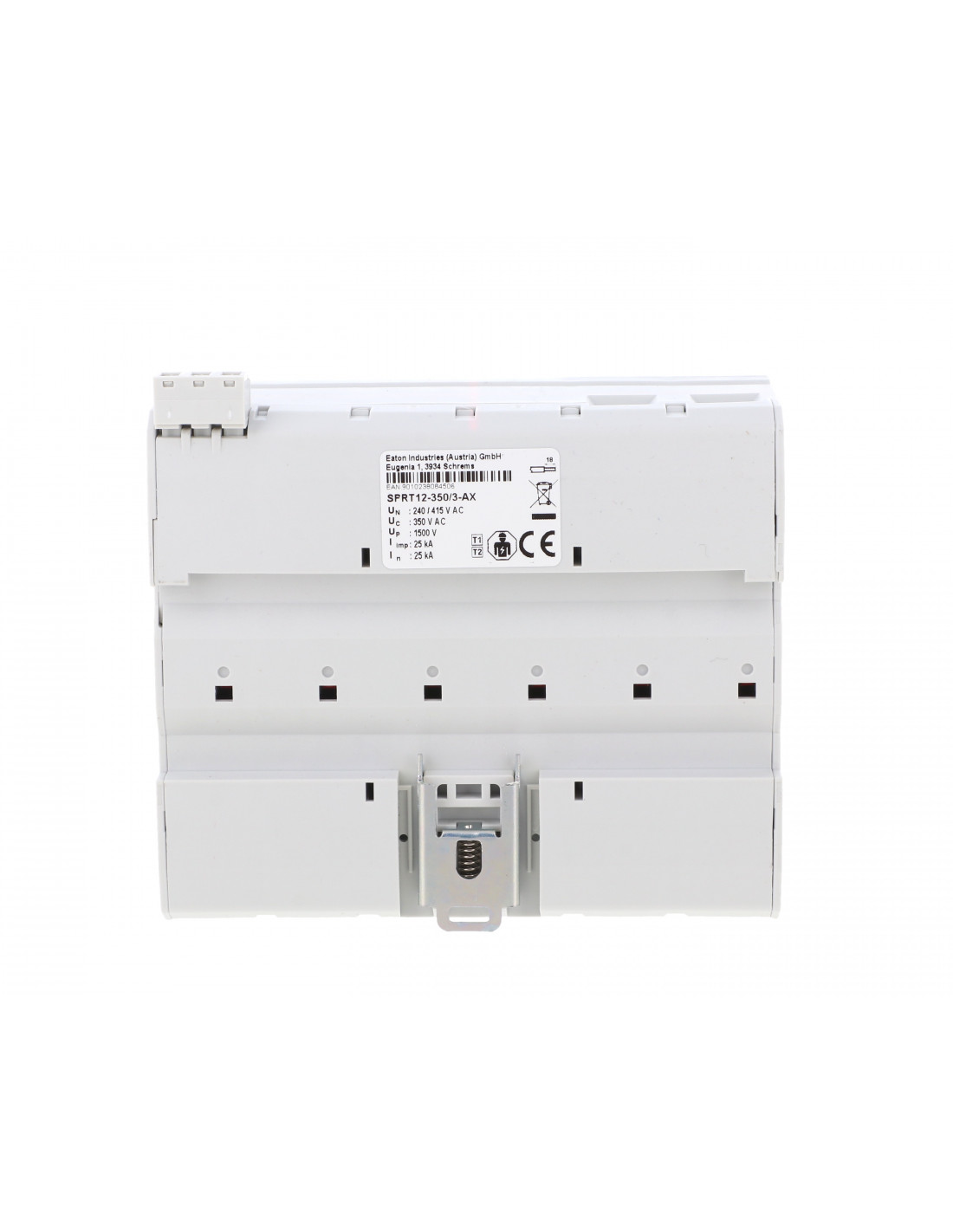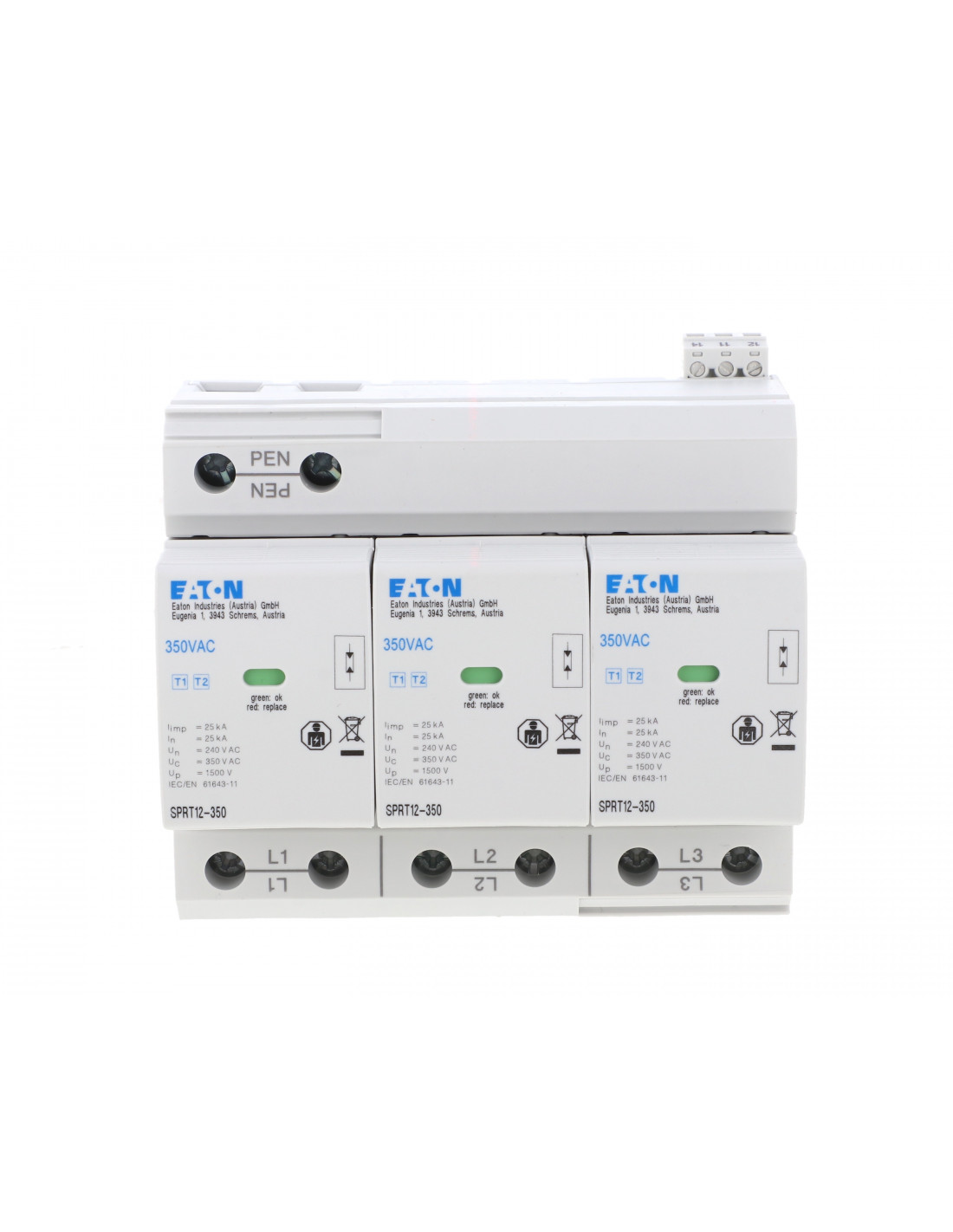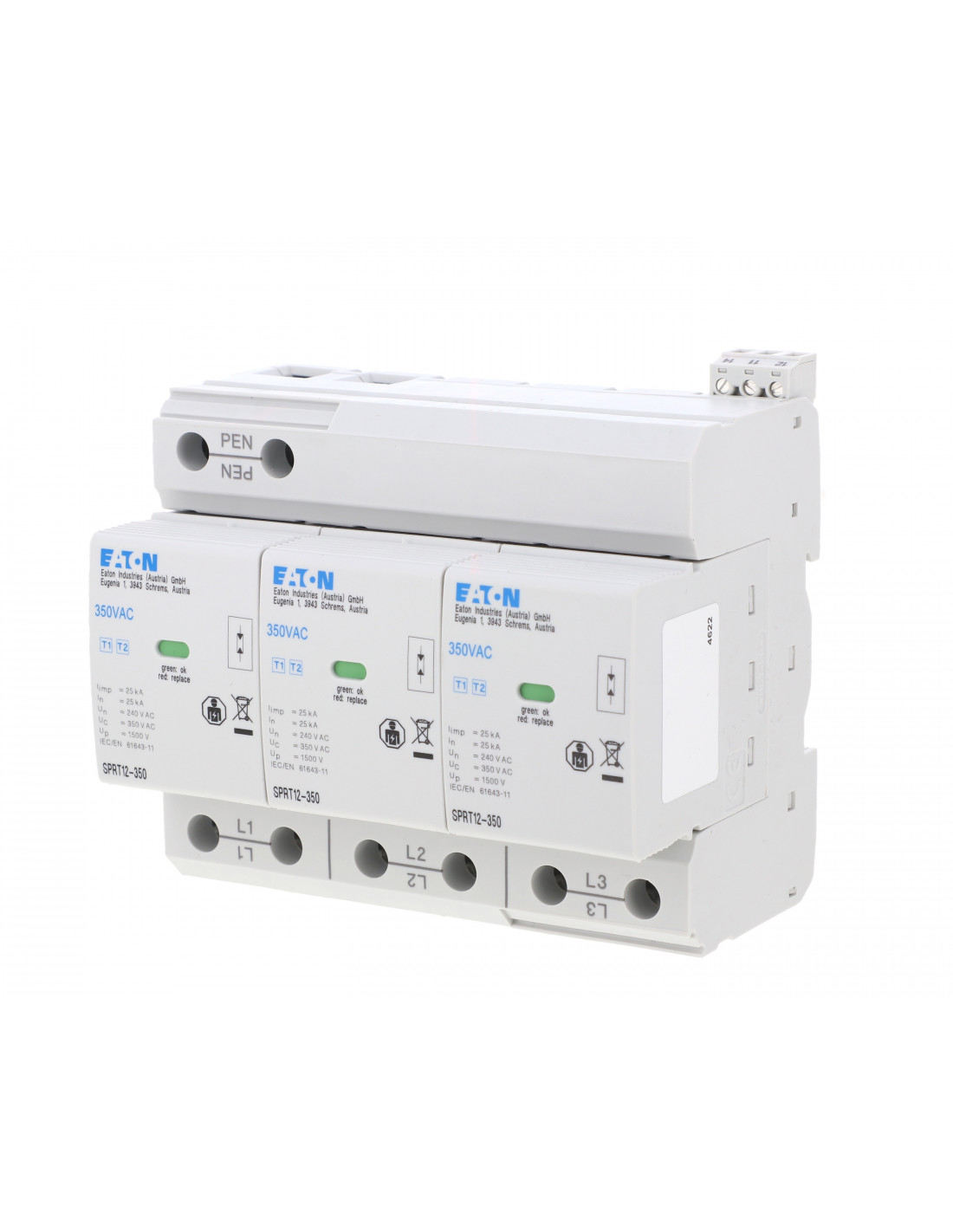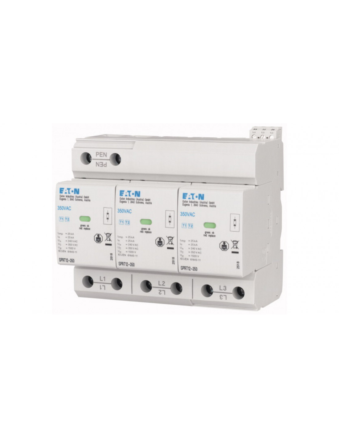Ogranicznik przepięć B+C Typ 1+2 3P 25kA 240V SPRT12-350/3-AX 195235 Główne cechy produktu Ograniczniki przepięć serii SPRT12 to wszechstronne urządzenia chroniące instalacje elektryczne przed skutkami przepięć. Aparaty te klasy I+II, typu T1+T2 przeznaczone są do tłumienia wyładowań bezpośrednich i przepięć pośrednich. Ogranicznik przepięć klasy I+II zgodnie z IEC 61643‑1+A1 Ogranicznik przepięć typu T1+T2 zgodnie z EN 61643‑11 Wykonania o napięciu pracy AC 280 Wymienne wkłady Optyczna sygnalizacja uszkodzenia wkładu Zobacz video na temat ochronników przepięć i poznaj pełną ofertę zabezpieczeń niskiego napięcia Obowiązkowy element instalacji elektrycznej w Twoim domu Ochrona przed przepięciami elektrycznymi Przepięciówkę typu 1+2 (dawne B+C) montuje się w celu ochrony instalacji elektrycznych przed skutkami pośrednich wyładowań piorunowych i przepięć łączeniowych. Stosuje się go jako uzupełnienie ochrony za ogranicznikami typu 1, w podrozdzielnicach. ROZDZIELNICE ODDZIAŁOWE | ROZDZIELNICE PIĘTROWE | TABLICE ROZDZIELCZE Dlaczego warto wybrać ogranicznik przepięć Eaton? Pełne bezpieczeństwo Chroni przed skutkami bezpośredniego i pośredniego wyładowania. Wymienne wkładki warystorowe (oraz sygnalizacja ich uszkodzenia) Tego typu ogranicznik stanowi idealne zabezpieczenie przed przepięciami powstałymi w wyniku pośrednich wyładowań atmosferycznych lub procesów łączeniowych w sieci elektrycznej. Szybka weryfikacja stanu urządzenia Czerwone pole na optycznym wskaźniku uszkodzenia wkładu oznacza konieczność wymiany wkładu. Zielone ‑ prawidłową pracę urządzenia. Łatwy w montażu, wygodny w użyciu Informacja o stanie urządzenia na wyciągnięcie ręki Optyczny wskaźnik przepalenia wkładki Zaciski windowe i szynowe Informacja o kluczowych parametrach Prosty montaż na szynie DIN Specyfikacja techniczna: Typ: SPRT12-350/3-AX Typ ogranicznika: T1+T2 Rozmiar: 6 modułów Liczba biegunów: 3 Maksymalny poziom ochrony L-PE/N-PE [kV]: 1,5 Maksymalne napięcie trwałej pracy AC [V]: 350 Sygnalizacja zadziałania na urządzeniu: Optyczna Znamionowe napięcie AC [V]: 240 Poziom ochrony Up [kV]: 1,5 Prąd udarowy (10/350) [kA]: 75 Zdolność gaszenia prądu następczego [kA]: 50 Maksymalny poziom ochrony L-N [kV]: 1,5 Główne czynniki powstawania przepięć Ostre burze lub awarie elektryczne mogą prowadzić do powstawania przepięć. Te z kolei do uszkodzenia instalacji elektrycznej. W ich wyniku zniszczone mogą zostać sprzęty elektryczne podłączone do sieci. Dlatego obiekty przemysłowe, usługowe i mieszkalne powinny być wyposażone w instalację odgromową oraz w ochronniki przeciwprzepięciowe. Ochrona przed wyładowaniami piorunowymi i przepięciami łączeniowymi jest bardzo ważna dla bezpieczeństwa obiektu. Może ona ograniczyć zagrożenia pożarowe i porażeniowe w obiekcie. Ograniczniki przepięć w instalacjach elektrycznych Ograniczniki przepięć służą do ochrony urządzeń elektrycznych przed skutkami przepięć, wyładowań atmosferycznych i uderzenia pioruna. Wzrost napięcia w sieci wywołany przykładowo uderzeniem pioruna powoduje zadziałanie ogranicznika i obniżenie napięcia w sieci do poziomu bezpiecznego dla odbiorników elektrycznych. Ogranicznik przepięć to obowiązkowe zabezpieczenie w Polsce każdej instalacji elektrycznej. Ograniczniki przepięć firmy EATON zapewniają skuteczną ochronę przeciwprzepięciową. Ich zaletą jest zastosowanie warystorów, które cechują się szybkością działania i wyjątkową zdolnością do pochłaniania energii. Dodatkowo posiadają optyczny wskaźnik uszkodzenia, który umożliwi podjęcie działania na czas, gdy urządzenie zostanie uszkodzone. Ograniczniki przeciwprzepięciowe SPCT2 należy instalować w : 1 2 3 4 5 budynkach z zewnętrzną z instalacją piorunochronną budynkach z zewnętrzną linią napowietrzną i instalacją piorunochronną chronionym obiekcie, w którym jako instalację odgromową wykorzystano wewnętrzną konstrukcję stalową budynkach zasilanych linią kablową, gdy odległość między budynkiem a stacją trafo jest niewielka (możliwość wystąpienia dużych prądów zwarciowych) obiektach bez instalacji odgromowej w bliskim sąsiedztwie obiektów wysokich, gdy uziomy obiektów są połączone Poznaj asortyment produktów Eaton i wybierz odpowiedni ogranicznik dla siebie Klasa testowa I/II dla instalacji fotowoltaicznej [T1/2 PV] Klasa testowa II dla instalacji fotowoltaicznej [T2 PV] Klasa testowa I/II [T1/2] Klasa testowa II [T2] Klasa testowa III [T3] Samodzielny montaż na szynie DIN Podłącz do obecnie używanej instalacji Zestawy zaleca się instalować (rozpatrując od strony zasilania) przed urządzeniami pomiarowymi i różnicowoprądowymi. Zapobiega się w ten sposób błędnemu działaniu wyłączników różnicowoprądowych podczas przepływu prądu udarowego po zadziałaniu ograniczników przepięć. Światowe zapotrzebowanie na energię elektryczną stale rośnie Eaton jest firmą zajmującą się inteligentnym zarządzaniem energią, zaangażowaną w ochronę środowiska naturalnego i poprawę jakości życia ludzi na całym świecie. Dostarczamy rozwiązania elektryczne, które zużywają mniej energii, ulepszają niezawodność zasilania i sprawiają, że miejsca pracy oraz zamieszkania są bezpieczniejsze i wygodniejsze. Nasze produkty sprzedajemy w ponad 175 krajach. Najczęściej zadawane pytania Co to jest ogranicznik przepięć? Ogranicznik przepięć to zabezpieczenie elektryczne mające na celu ochronę instalacji elektrycznej i urządzeń przed skutkami wyładowań atmosferycznych oraz przepięć łączeniowych. Czy ogranicznik przepięć jest obowiązkowy? Od roku 2002 zgodnie z rozporządzeniem w sprawie warunków technicznych jakim powinny podlegać budynki i ich usytuowanie, ograniczniki przepięć są wymagane w nowo budowanych obiektach jako element ochrony przed wyładowaniami