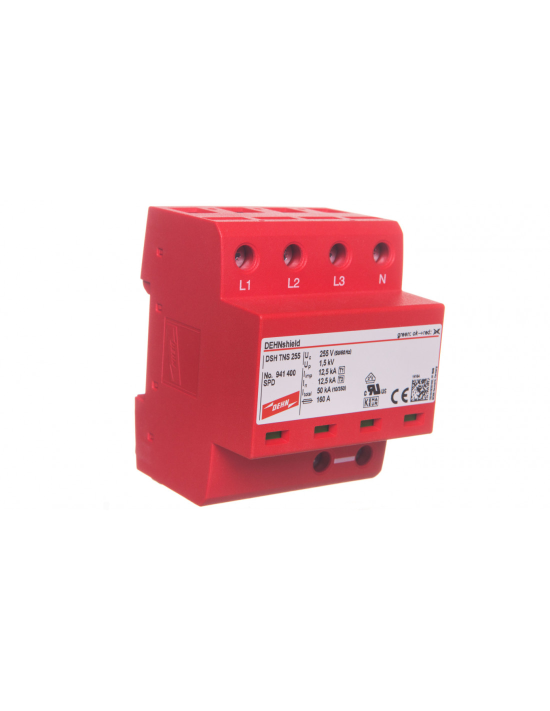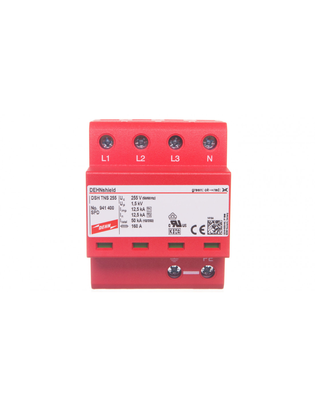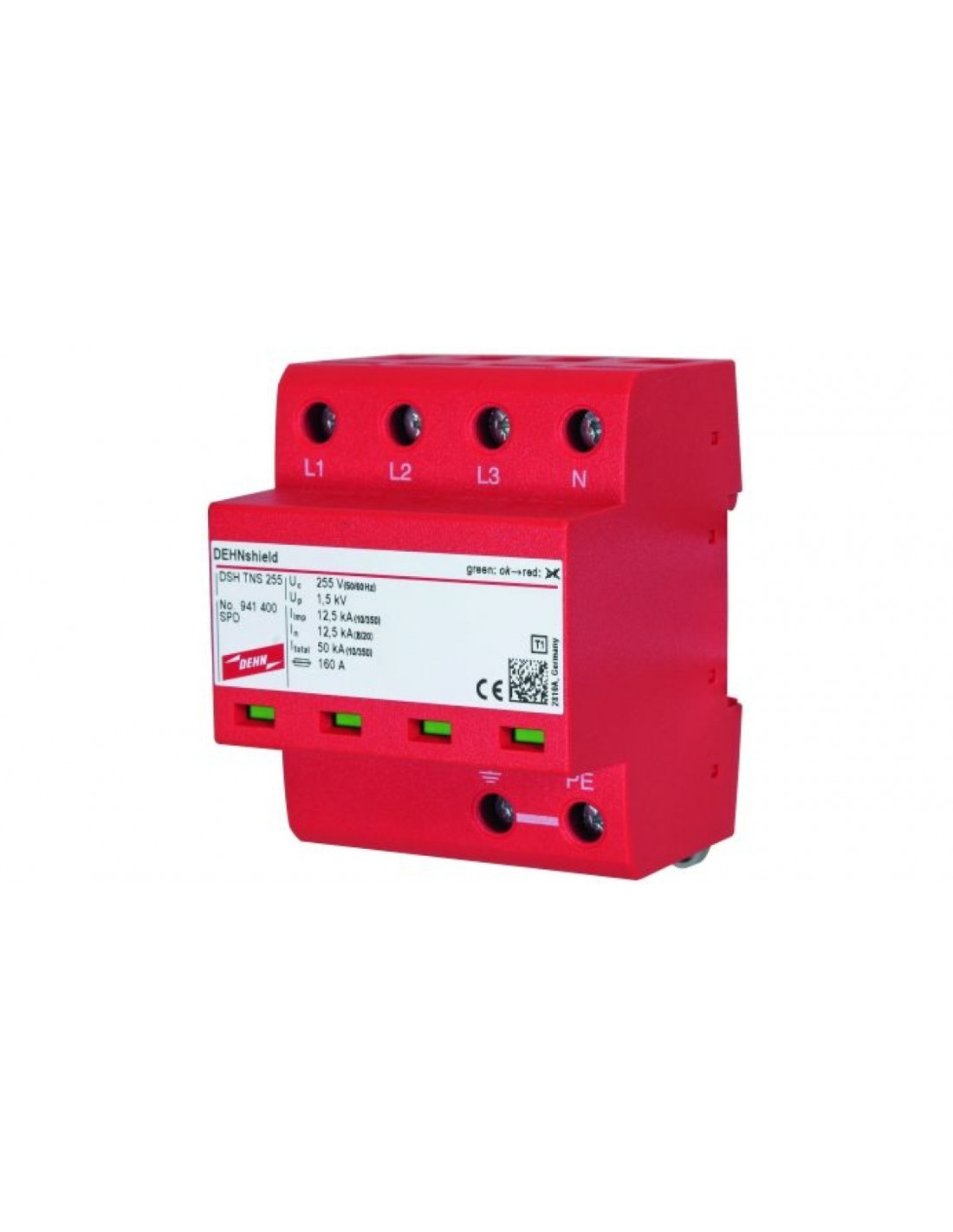 Ogranicznik przepięć jest to urządzenie niezbędne by zabezpieczyć instalację przed przepięciami które powstają wskutek wyładowań atmosferycznych albo w przypadku gdy w sieci elektrycznej powstają procesy łączeniowe. Dzięki temu aparatowi można uchronić urządzenia elektryczne zainstalowane w budynku przed uszkodzeniem lub całkowitym zniszczeniem. Powyższy ogranicznik przepięć 941400 producenta DEHN charakteryzuje się następującymi właściwościami: - jest czterobiegunowy - montuje się go na szynie DIN - szerokość wyrażona jest w 4 modułach - klasy B+C - kombinowany na bazie iskierników - znamionowy prąd wyładowczy (8/20) 12,5/50kA - napięciowy poziom ochrony 1,5kV - stopień ochrony IP20